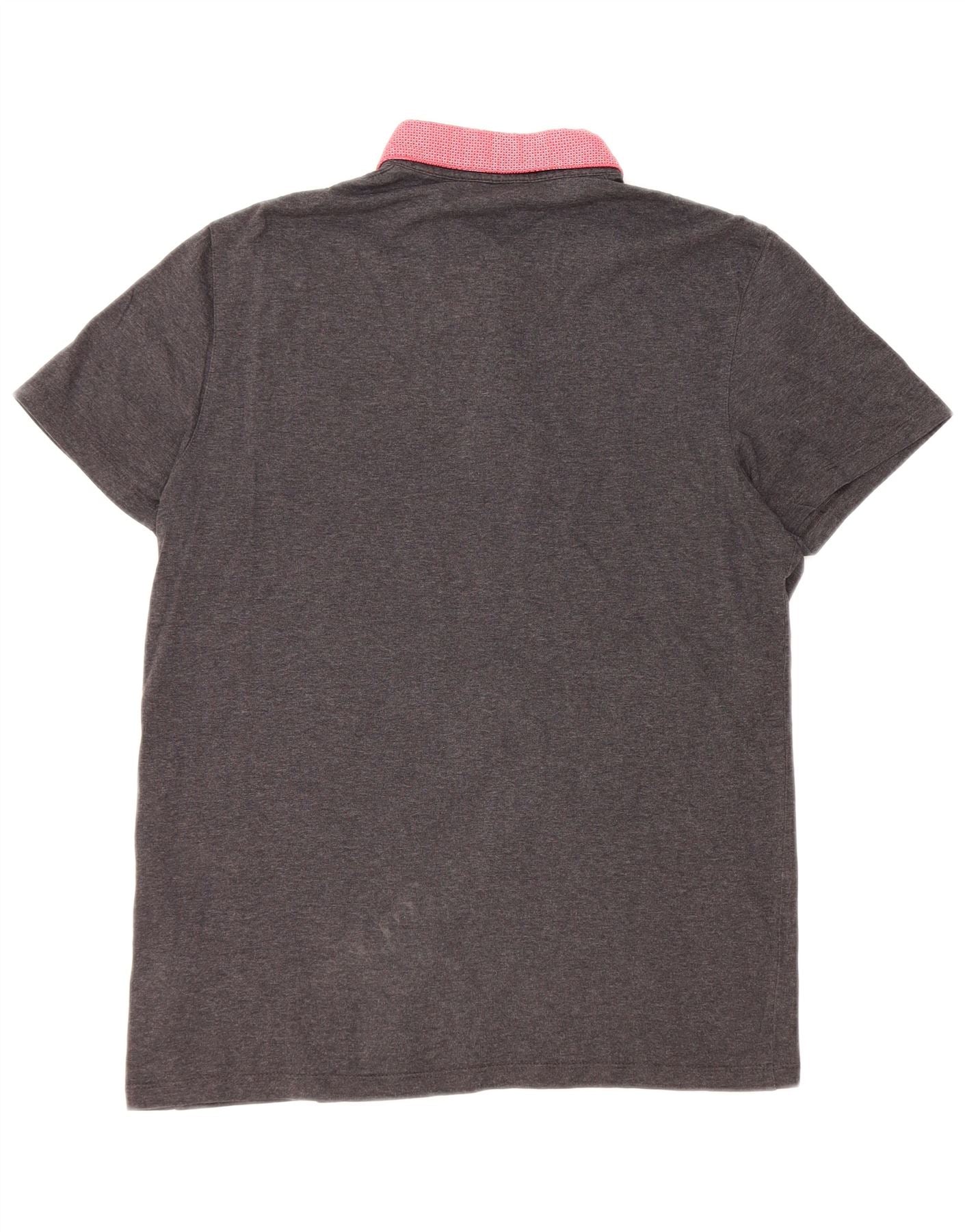 - Descrição da IA: Esta camiseta masculina Ted Baker é confeccionada em jersey de algodão cinza macio com um padrão sutil salpicado. Possui decote clássico com gola e mangas curtas. O forro da gola e a carcela de botões apresentam um tom vermelho contrastante com um padrão abstrato. Botões tonais fornecem detalhes refinados. Um ajuste regular garante um uso confortável para uma estética casual elegante.