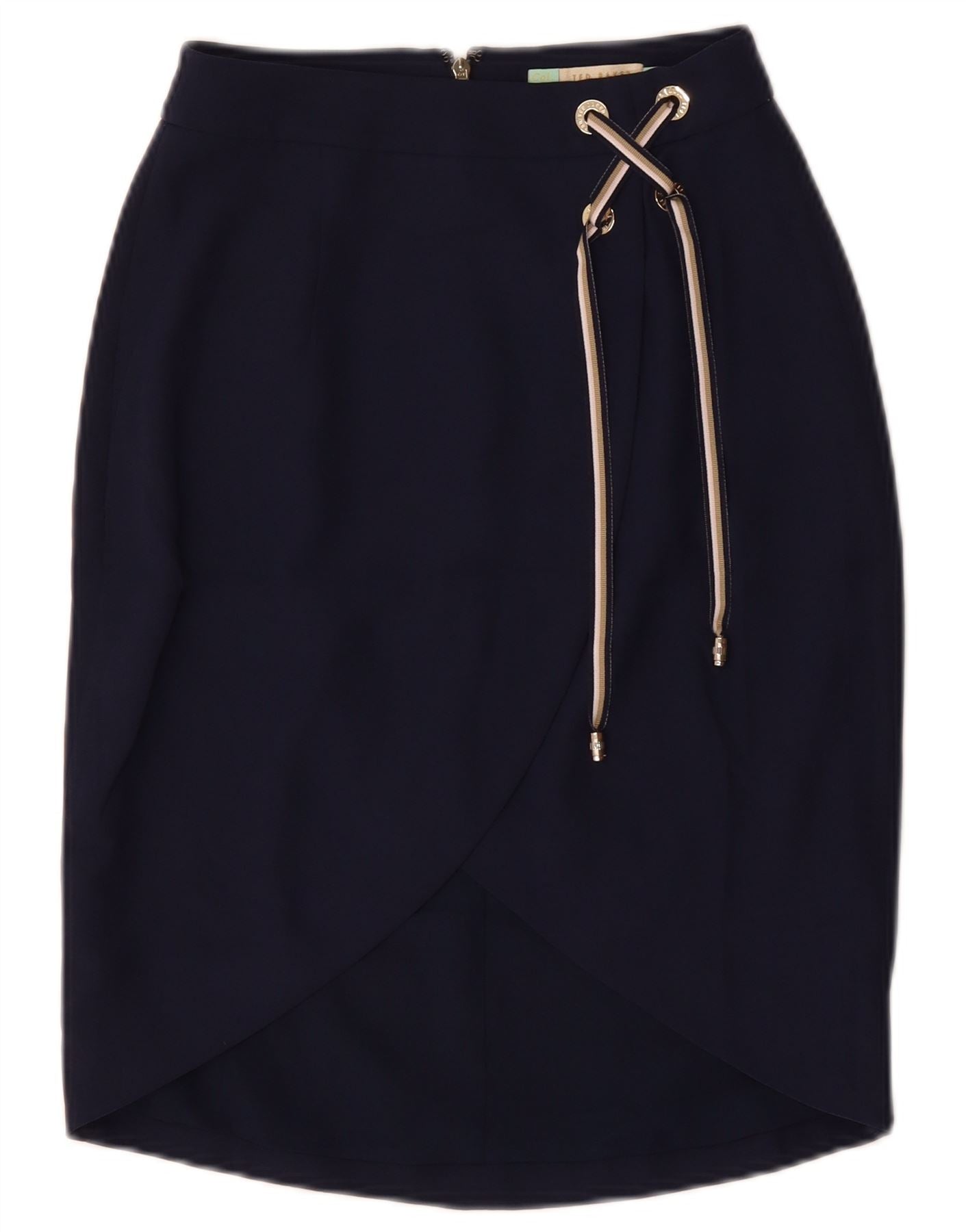 - Descrição da IA: Esta saia envolvente feminina Ted Baker é confeccionada em um tecido liso azul marinho. Apresenta um design assimétrico moderno com um ajuste fino. O estilo envolvente cria uma silhueta lisonjeira. Um fecho de correr garante um acabamento elegante. Detalhes de cadarço com pontas de metal adicionam um toque distinto. A cintura ajustável oferece uma sensação confortável e personalizada. Esta saia combina estilo contemporâneo com elegância prática.