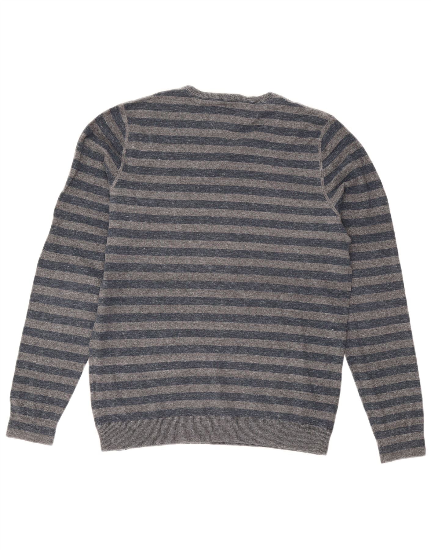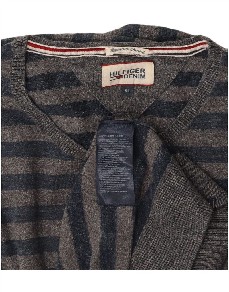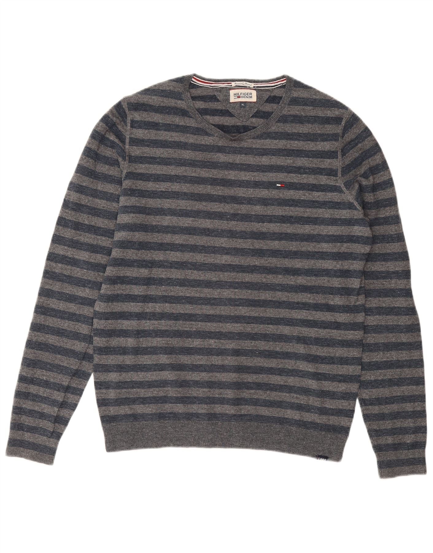 TOMMY HILFIGER Mens Crew Neck Jumper Sweater XL Grey Striped Cotton