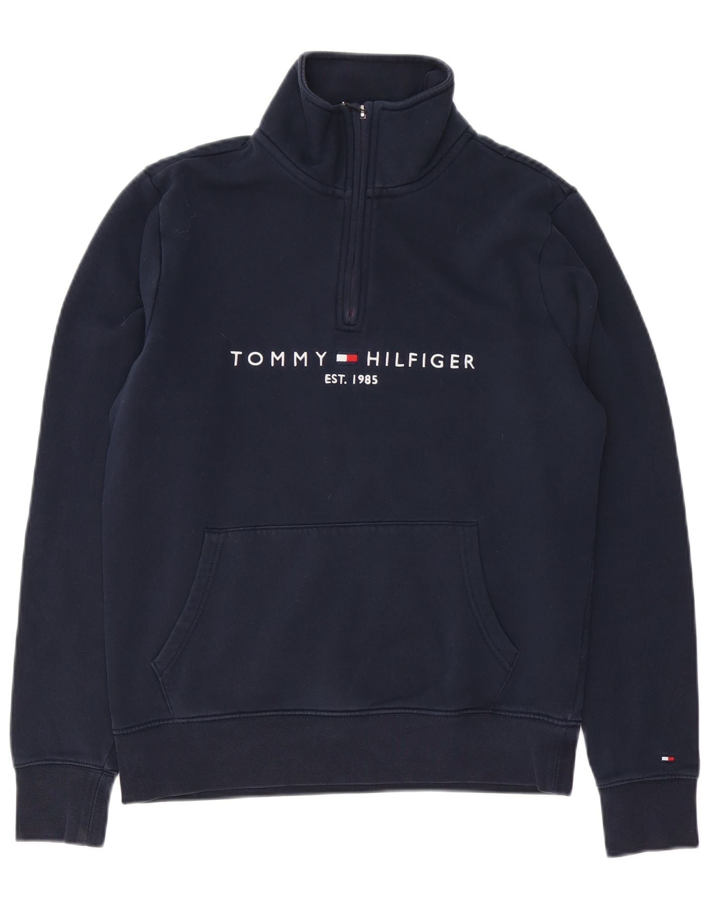 - Descrição da IA: Este moletom masculino Tommy Hilfiger é confeccionado em jersey macio de mistura de algodão orgânico azul marinho. Possui gola alta e prático fecho de correr 1/4. As mangas compridas são finalizadas com punhos canelados confortáveis. O corte regular garante facilidade de movimento e uma silhueta clássica. Um logotipo proeminente TOMMY HILFIGER EST 1985 é exibido no peito. Um prático bolso canguru acrescenta detalhes funcionais.