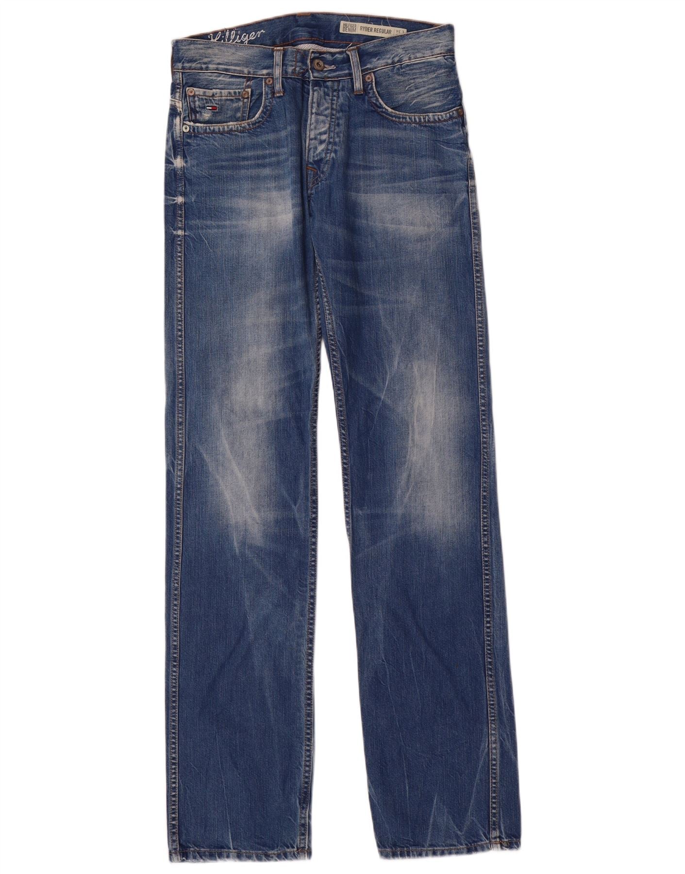 - Descrição da IA: Estes jeans retos masculinos Tommy Hilfiger Ryder Regular são confeccionados em jeans 100% algodão em uma clássica lavagem azul. Eles apresentam um corte regular com pernas retas para uma silhueta atemporal. O fecho de botão garante uma fixação segura e tradicional. Detalhes sutis e desgastados adicionam uma estética desgastada. Bolsos práticos e um logotipo da marca completam o design.