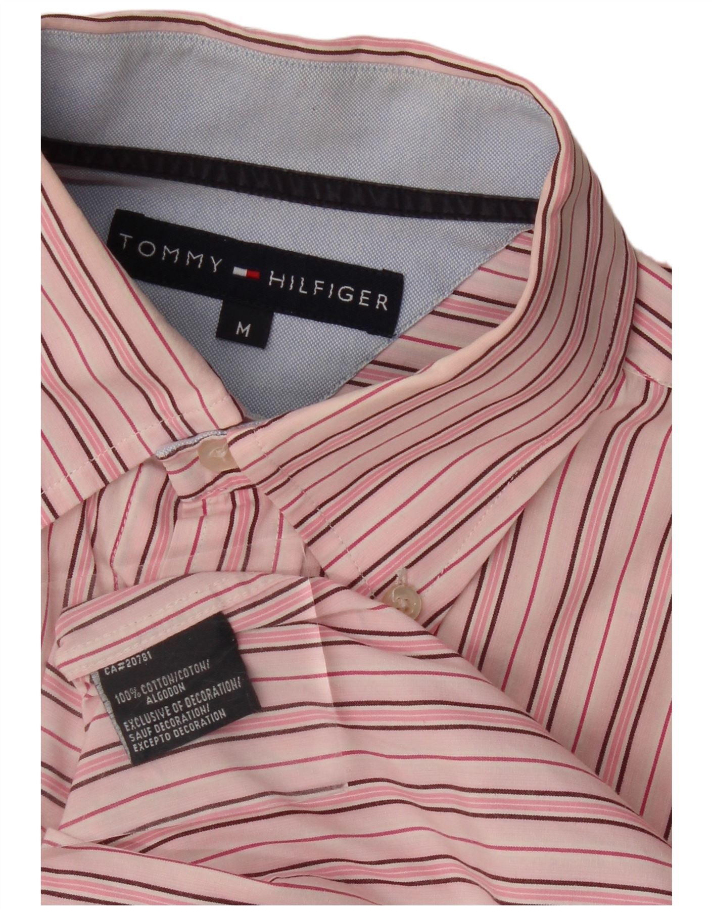 - Descrição da IA: Esta camisa Oxford masculina Tommy Hilfiger é confeccionada em tecido 100% algodão. Possui decote clássico com gola e botões frontais completos. A base rosa é adornada com um padrão listrado nítido, oferecendo uma estética refinada. Mangas compridas com punhos abotoados completam o design. Um logotipo bordado sutil adiciona um toque exclusivo a esta peça de roupa de corte regular.