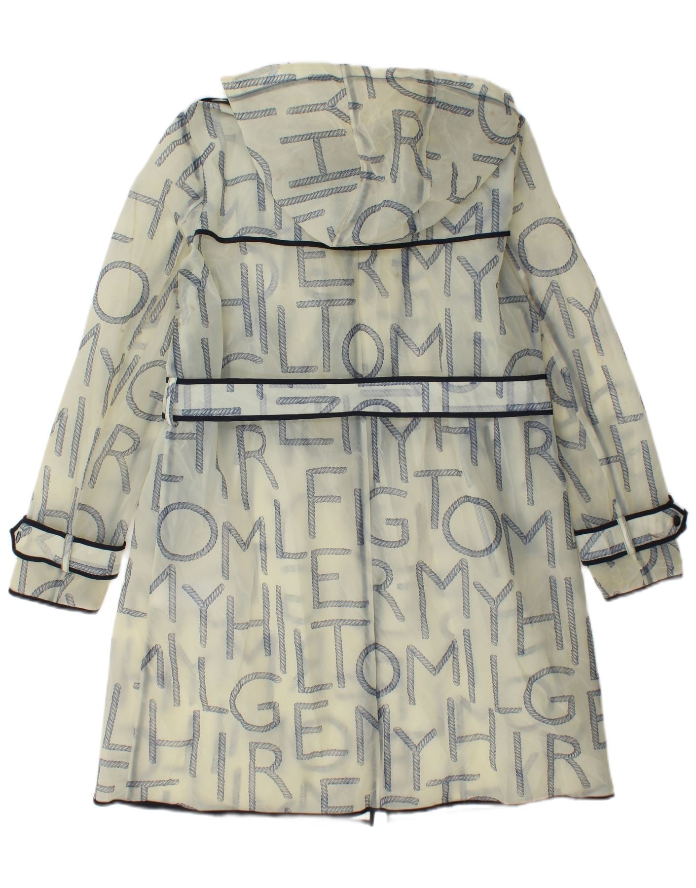 - Descrição da IA: Esta capa de chuva feminina Tommy Hilfiger é confeccionada em tecido de poliuretano leve e transparente na cor off-white. Apresenta um padrão geométrico distinto, semelhante a motivos de corda, numa cor escura contrastante. O debrum preto delineia as bordas e costuras. O decote com gola e fecho de botão oferecem um visual clássico. Inclui um capuz prático e mangas compridas. Um ajuste regular garante um uso confortável. Os bolsos funcionais acrescentam utilidade e o material resistente à água proporciona proteção.