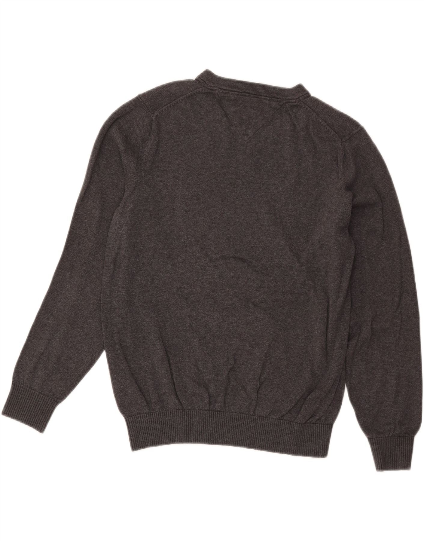 - Descrição da IA: Este suéter masculino Tommy Hilfiger com decote em V é confeccionado em malha leve 100% algodão. Sua textura cinza suave oferece conforto de uso. O clássico decote em V apresenta detalhes listrados sutis. As mangas compridas terminam com punhos elegantes, complementando o corte regular. Um pequeno logotipo bordado no peito acrescenta um toque exclusivo. Este estilo de pulôver é perfeito para camadas versáteis.