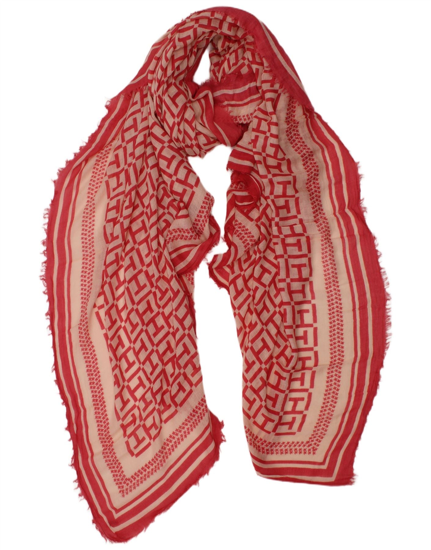 - AI Description: This Tommy Hilfiger womens scarf is crafted from a finely woven fabric. It features a striking geometric pattern in red, off white, and beige tones. A prominent logo accent adds signature designer appeal. The regular fit ensures versatile styling, allowing it to be draped or wrapped with ease. Its design offers a sophisticated touch to any ensemble, perfect for adding a pop of colour and style.