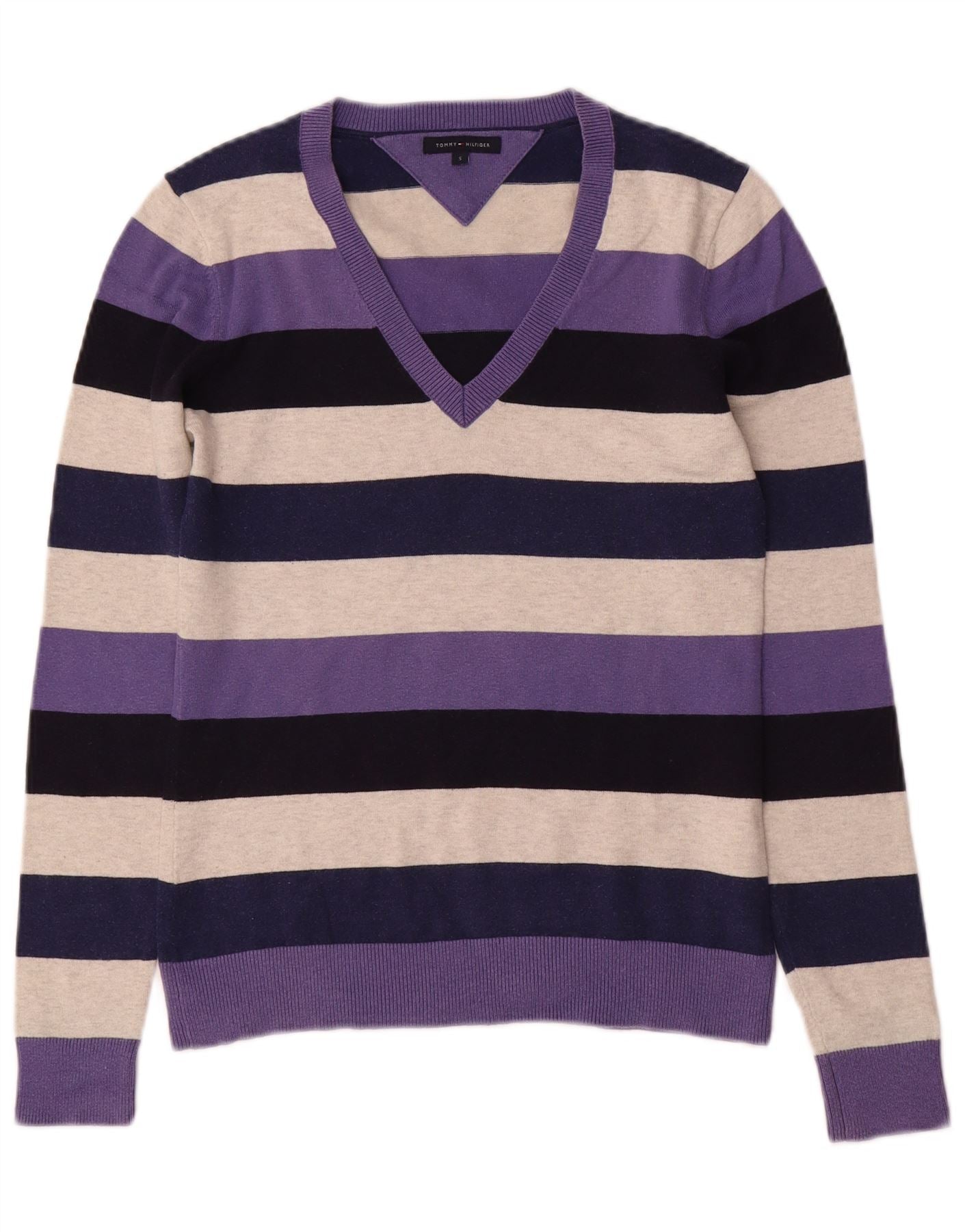 TOMMY HILFIGER Womens V-Neck Jumper Sweater UK 10 Small Purple Striped