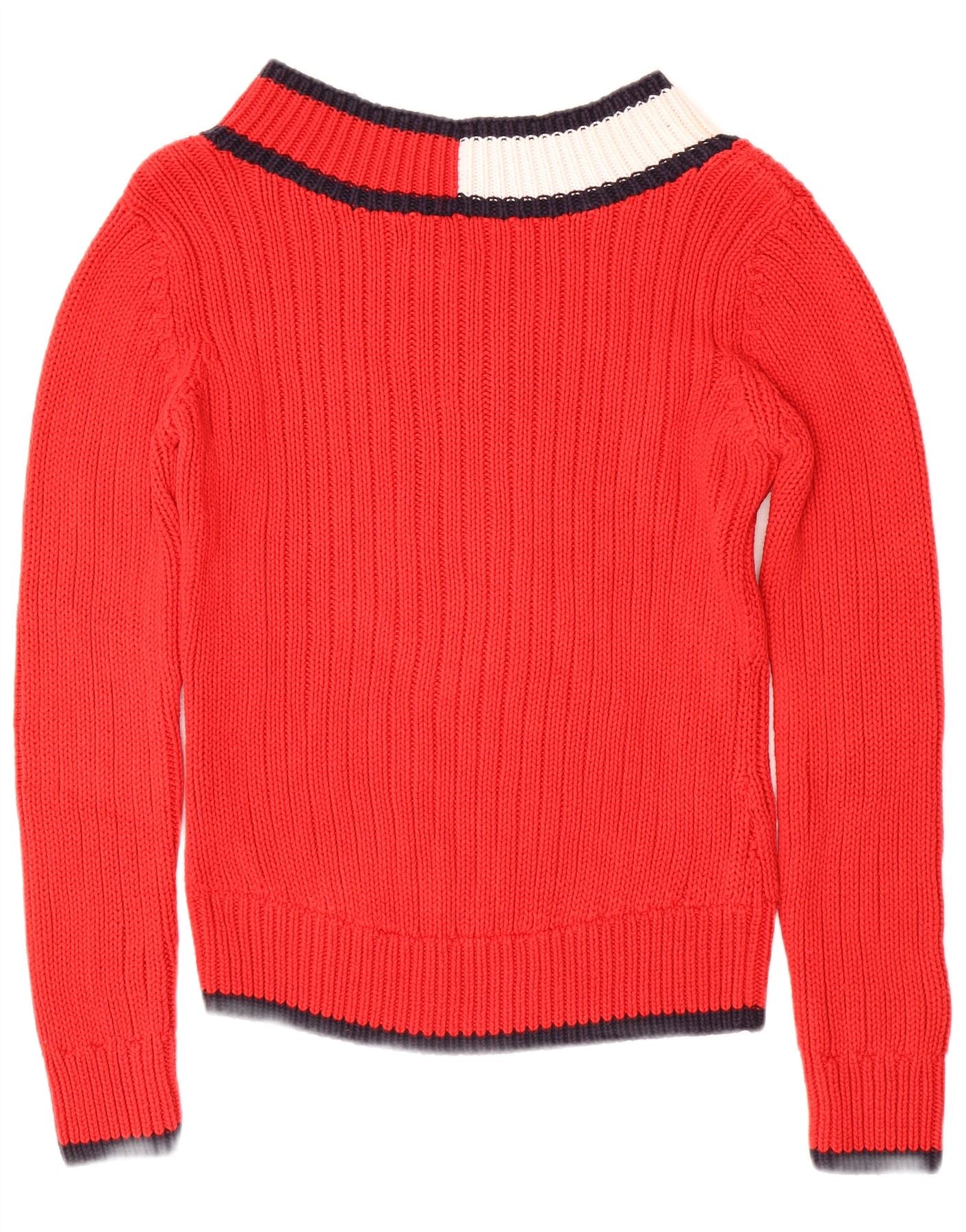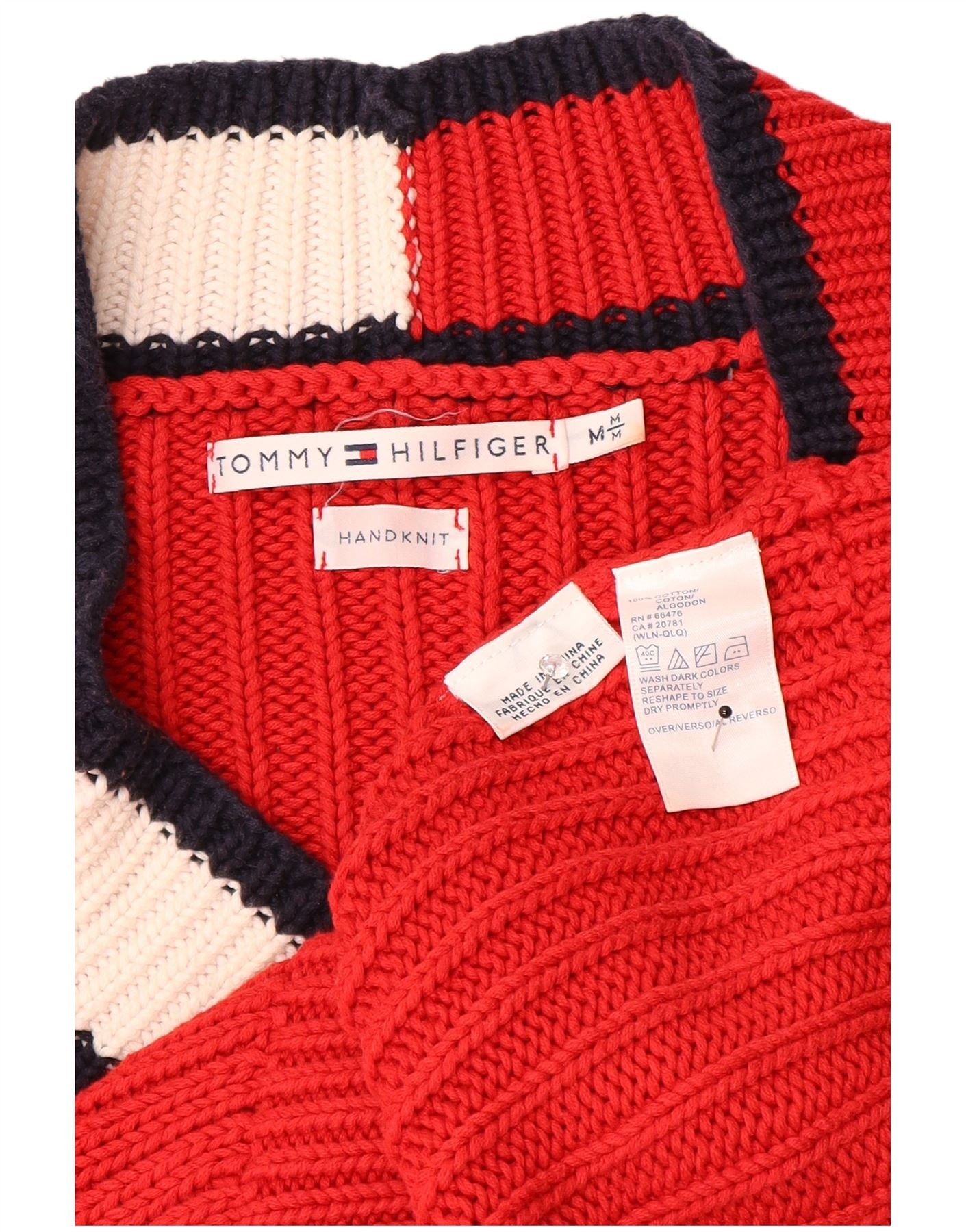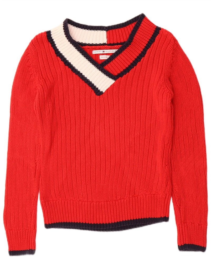 TOMMY HILFIGER Womens V-Neck Jumper Sweater UK 14 Medium Red Colourblock