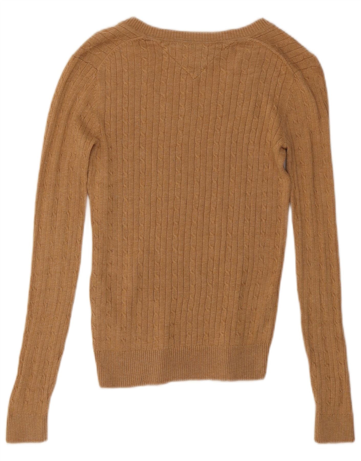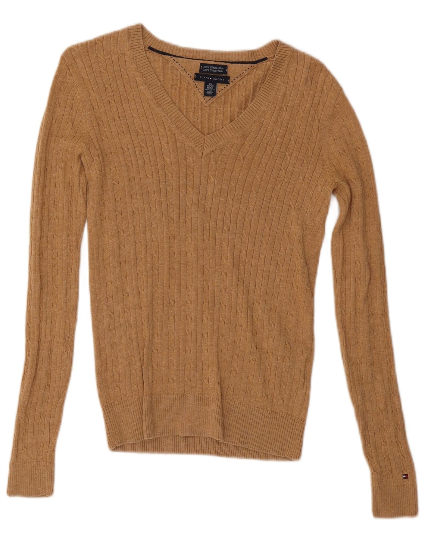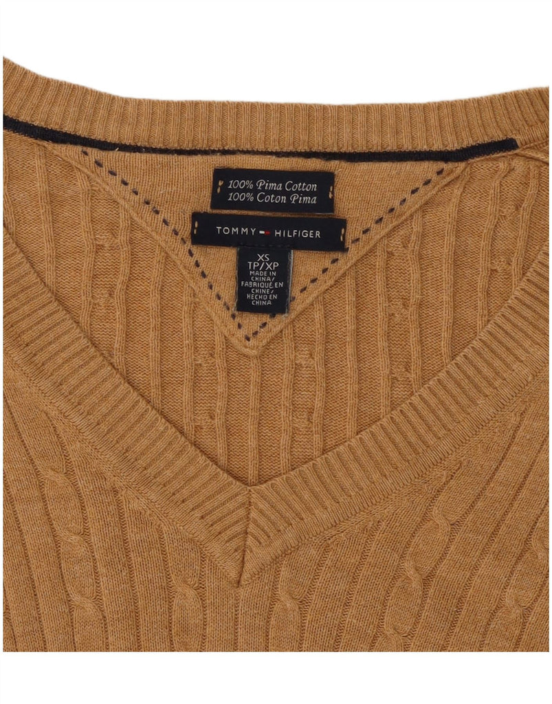 TOMMY HILFIGER Womens V-Neck Jumper Sweater UK 4 XS Brown Cotton