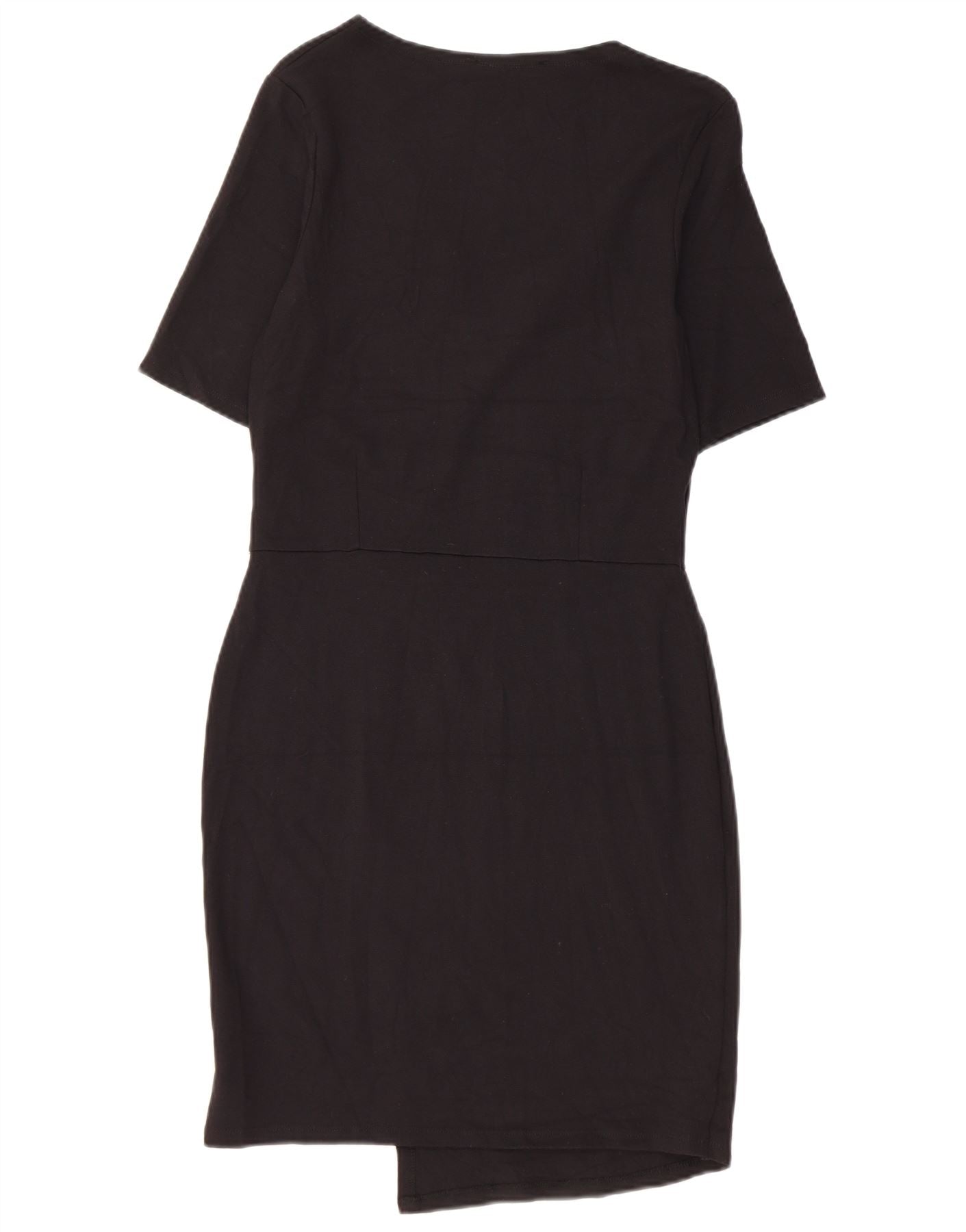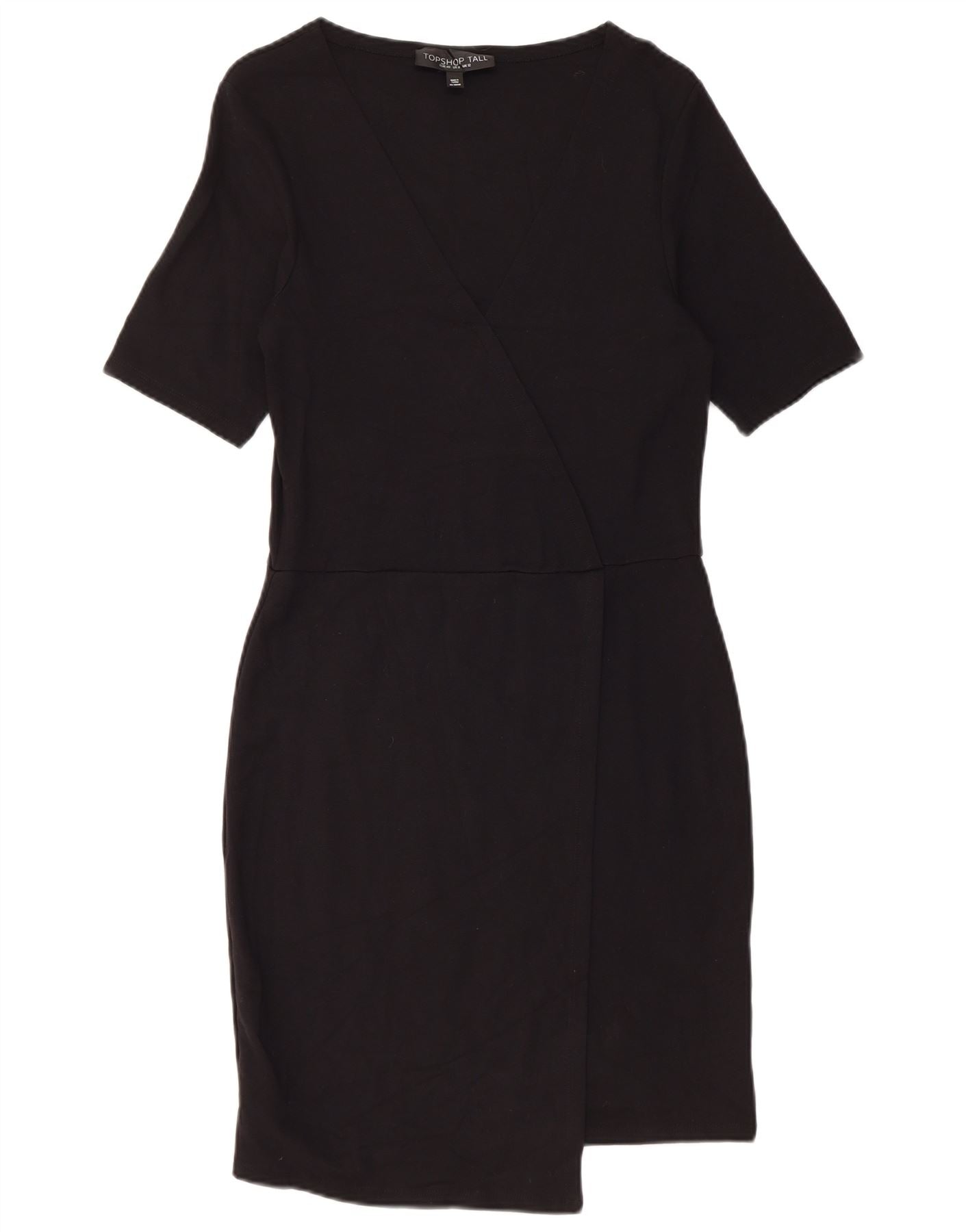 - Descrição da IA: Este vestido feminino da Topshop é feito de uma mistura suave de viscose preta, oferecendo elasticidade confortável. Possui decote redondo clássico e mangas curtas. O design do pulôver cria um corpete elegante em estilo envolvente. Uma bainha assimétrica adiciona um toque moderno e distinto. O corte regular garante uma silhueta lisonjeira, ideal para um estilo versátil.