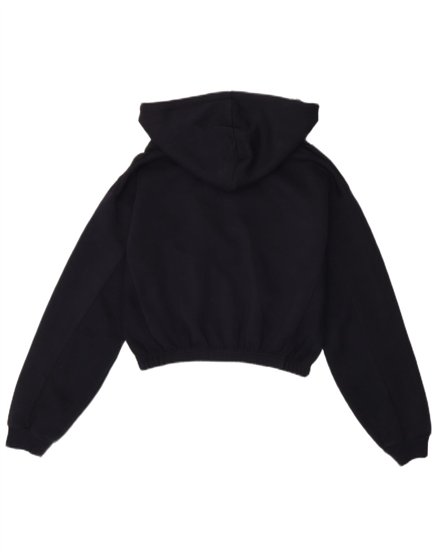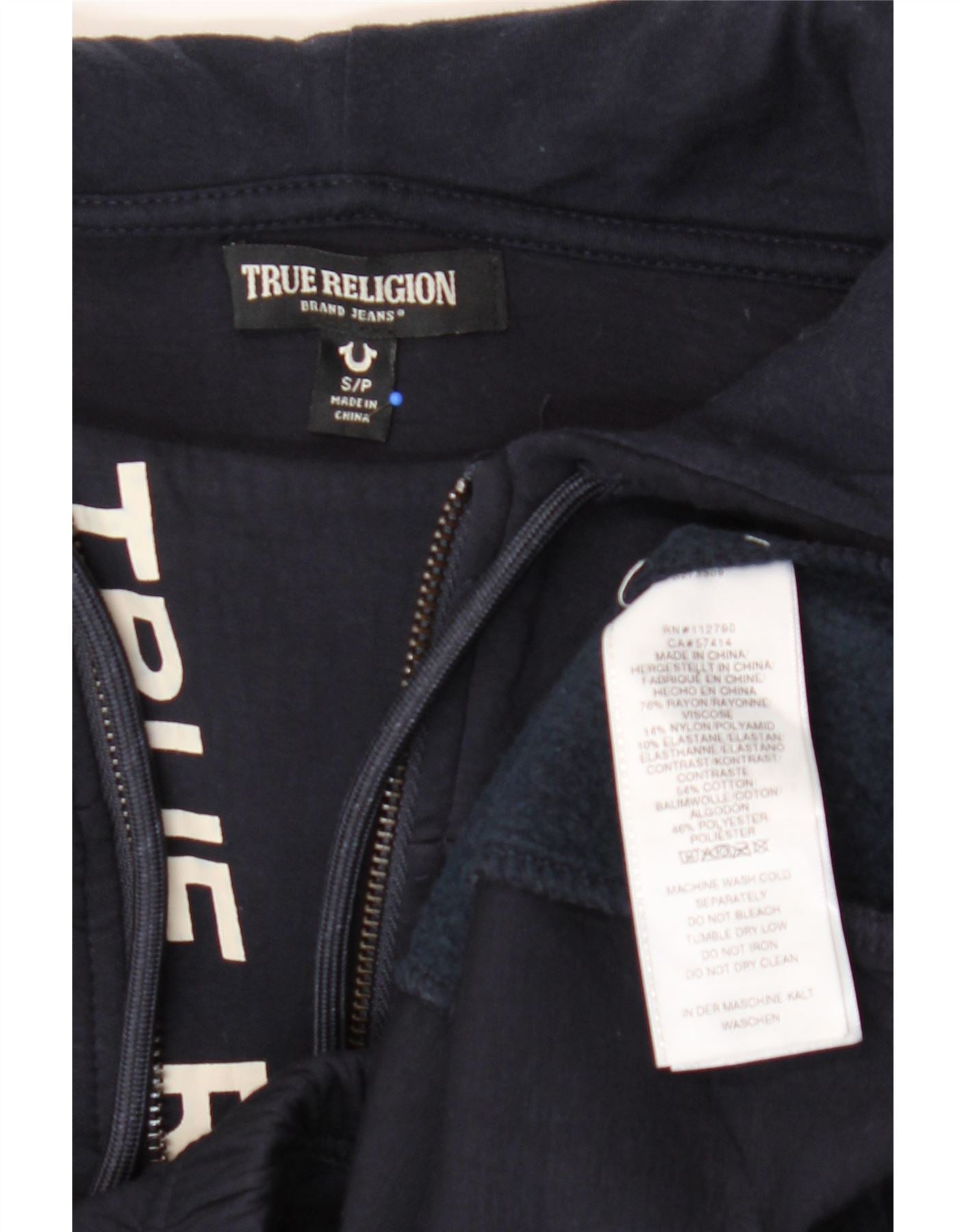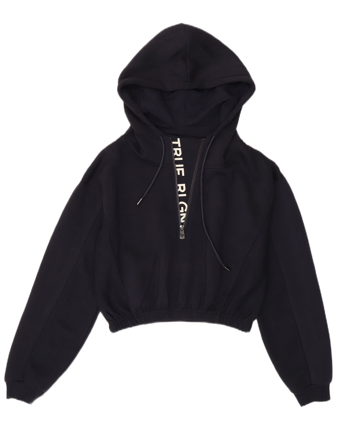 TRUE RELIGION Suéter feminino com capuz e gola com zíper UK 10 pequeno azul marinho