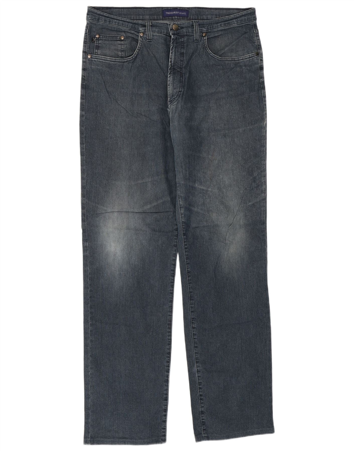 - Descrição da IA: Estes jeans retos masculinos Trussardi Jeans são confeccionados em jeans azul escuro com uma textura clássica. Eles apresentam um ajuste regular e perna reta para conforto atemporal. O fecho de botão e o design tradicional de cinco bolsos completam o visual. Acentos sutis do logotipo aparecem no remendo traseiro da cintura e nos rebites de metal. O estilo clássico oferece uso versátil para roupas do dia a dia.