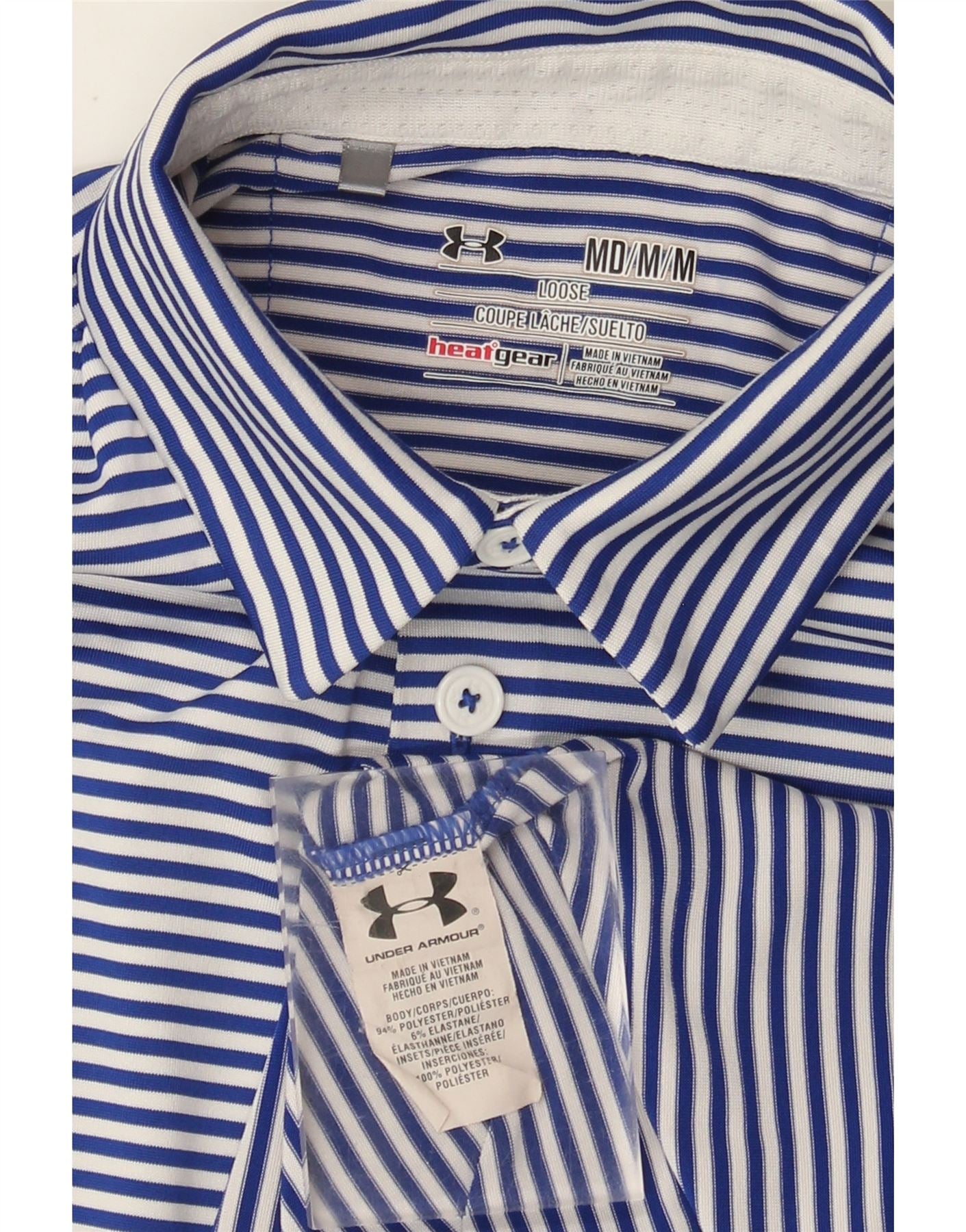 - Descrição da IA: Esta camisa polo masculina Under Armour é confeccionada em uma mistura de poliéster respirável, oferecendo elasticidade e conforto. Possui decote clássico com gola e carcela com botões. O padrão listrado azul e branco proporciona uma aparência elegante e atlética. Mangas curtas e ajuste atlético garantem facilidade de movimento, ideal para golfe. Um logotipo sutil da Under Armour completa o design.