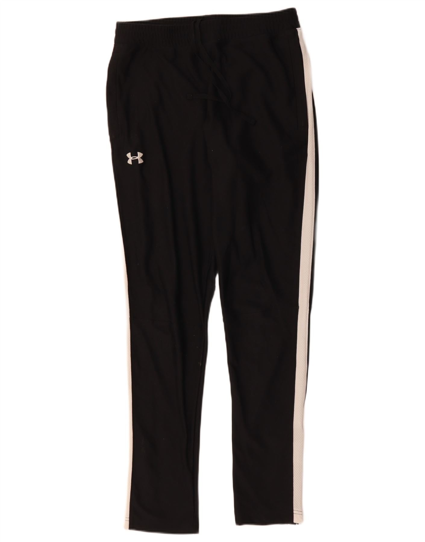 - Descrição da IA: Os corredores masculinos da Under Armour são confeccionados em tecido macio e mesclado, ideal para treinar. Eles apresentam um ajuste atlético com cintura elástica e cordão. As pernas oferecem um corte regular, afinando ligeiramente. Uma ousada faixa colorida branca percorre cada lado. Bolsos práticos e zíperes nos tornozelos melhoram a funcionalidade. O logotipo exclusivo da Under Armour adiciona um toque sutil.