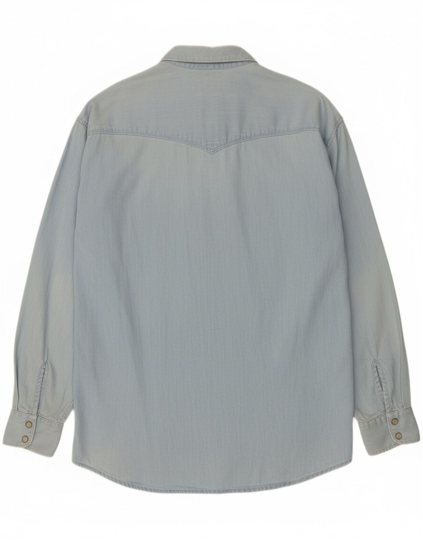 - Descrição da IA: Esta camisa jeans masculina Uniform é confeccionada em jeans 100% algodão azul claro. Possui decote clássico com gola e mangas compridas com punhos abotoados. O ajuste regular oferece um uso confortável. As cangas de estilo ocidental realçam os ombros. Bolsos duplos no peito com abas de botão acrescentam utilidade. Um detalhe sutil do logotipo vermelho está presente em um bolso. A frente com botões completos garante um fechamento seguro.