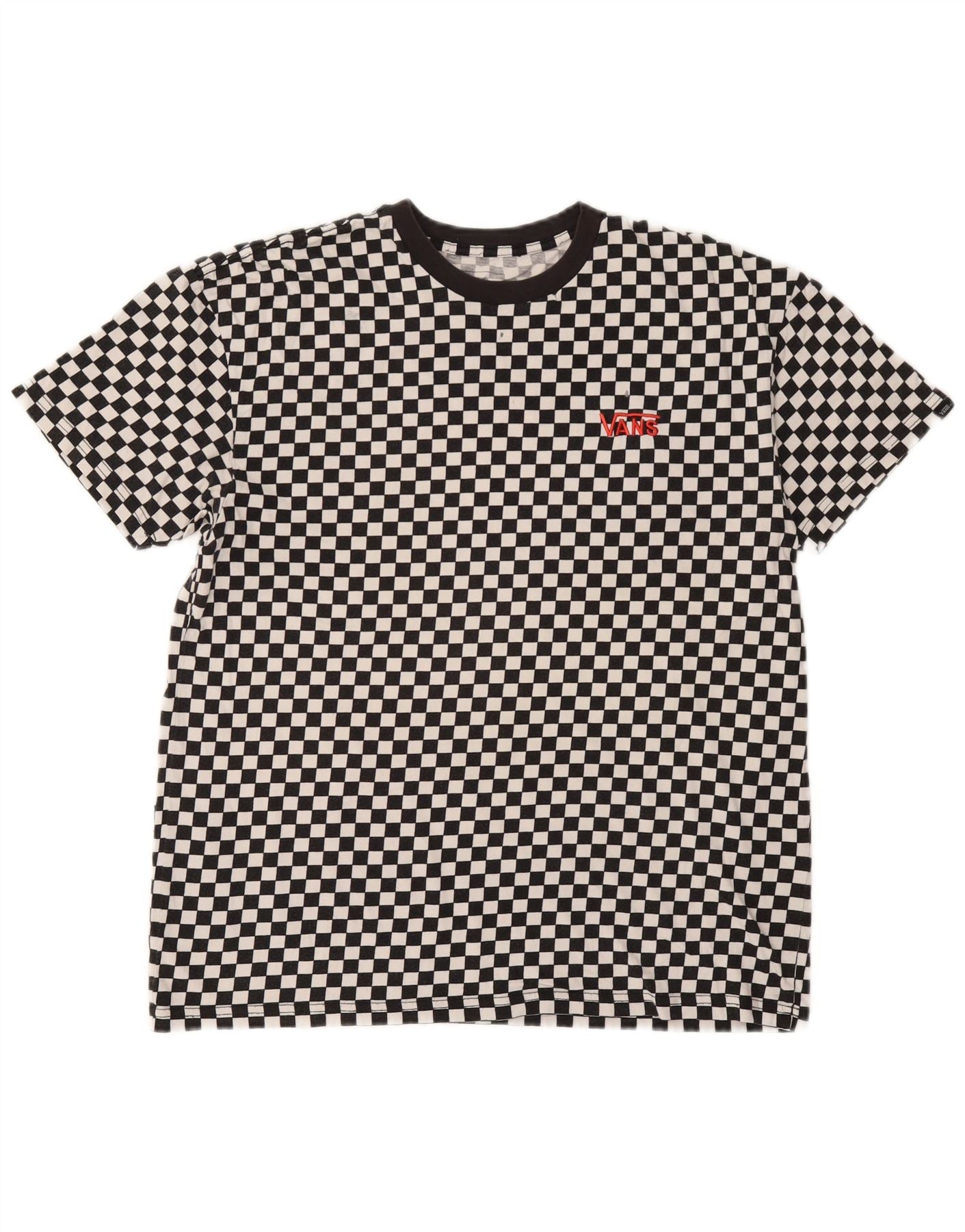 - Descrição da IA: Esta camiseta gráfica masculina da Vans é confeccionada em tecido jersey macio, apresentando um clássico padrão xadrez preto e branco. Possui gola redonda confortável e mangas curtas. O ajuste regular garante facilidade de uso. Um impressionante logotipo da Vans bordado em vermelho fica proeminente no peito. Este estilo retro oferece uma declaração visual ousada, perfeita para um look casual.
