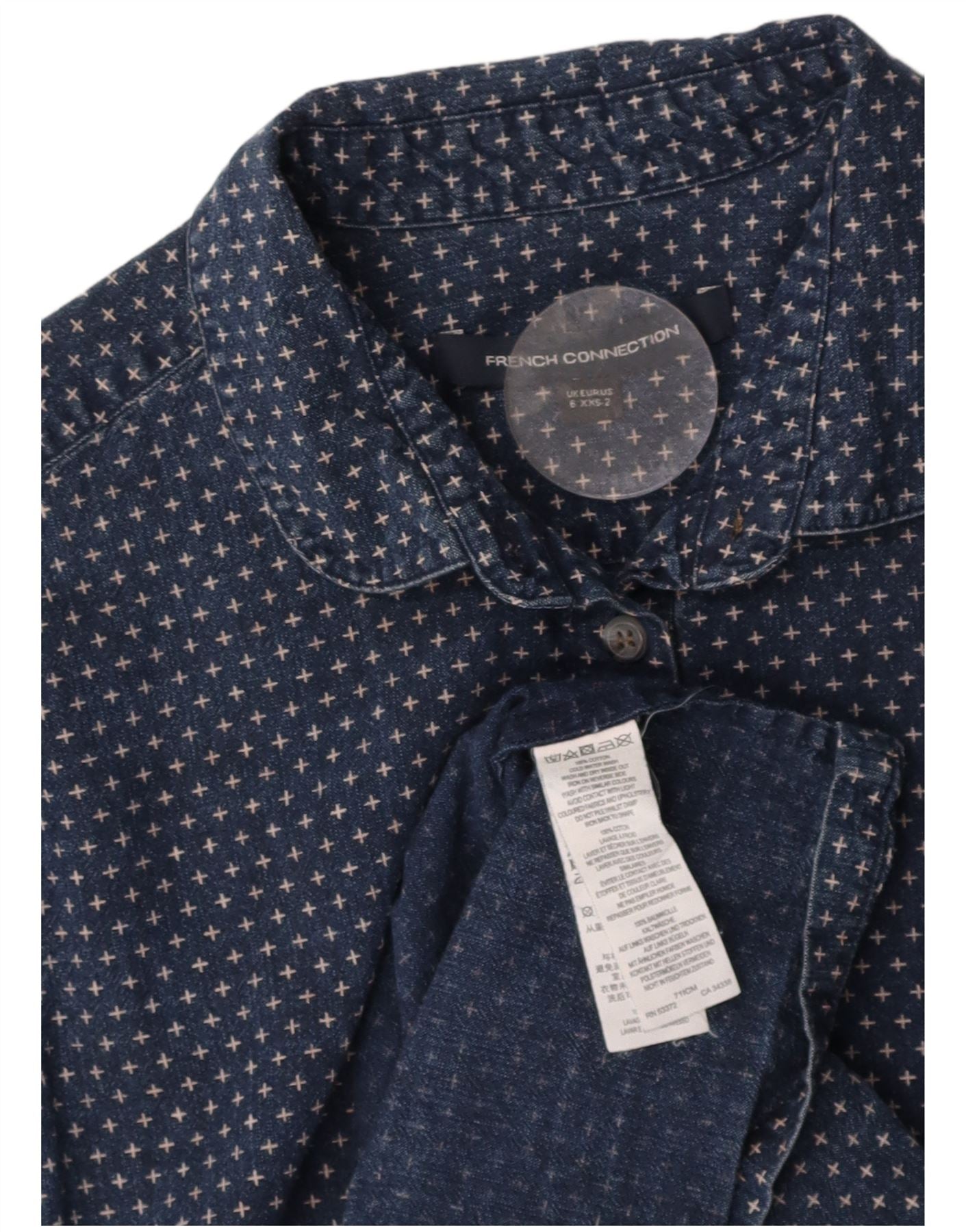 - Descrição da IA: Este vestido camisa feminino French Connection é confeccionado em jeans 100% algodão. Oferece uma sensação durável e confortável. O vestido apresenta decote clássico com gola e mangas compridas. Um fechamento completo com botões percorre a frente. Um impressionante padrão geométrico azul marinho acrescenta interesse visual contemporâneo. Seu ajuste relaxado garante facilidade de uso. Esta peça versátil combina estrutura com conforto.