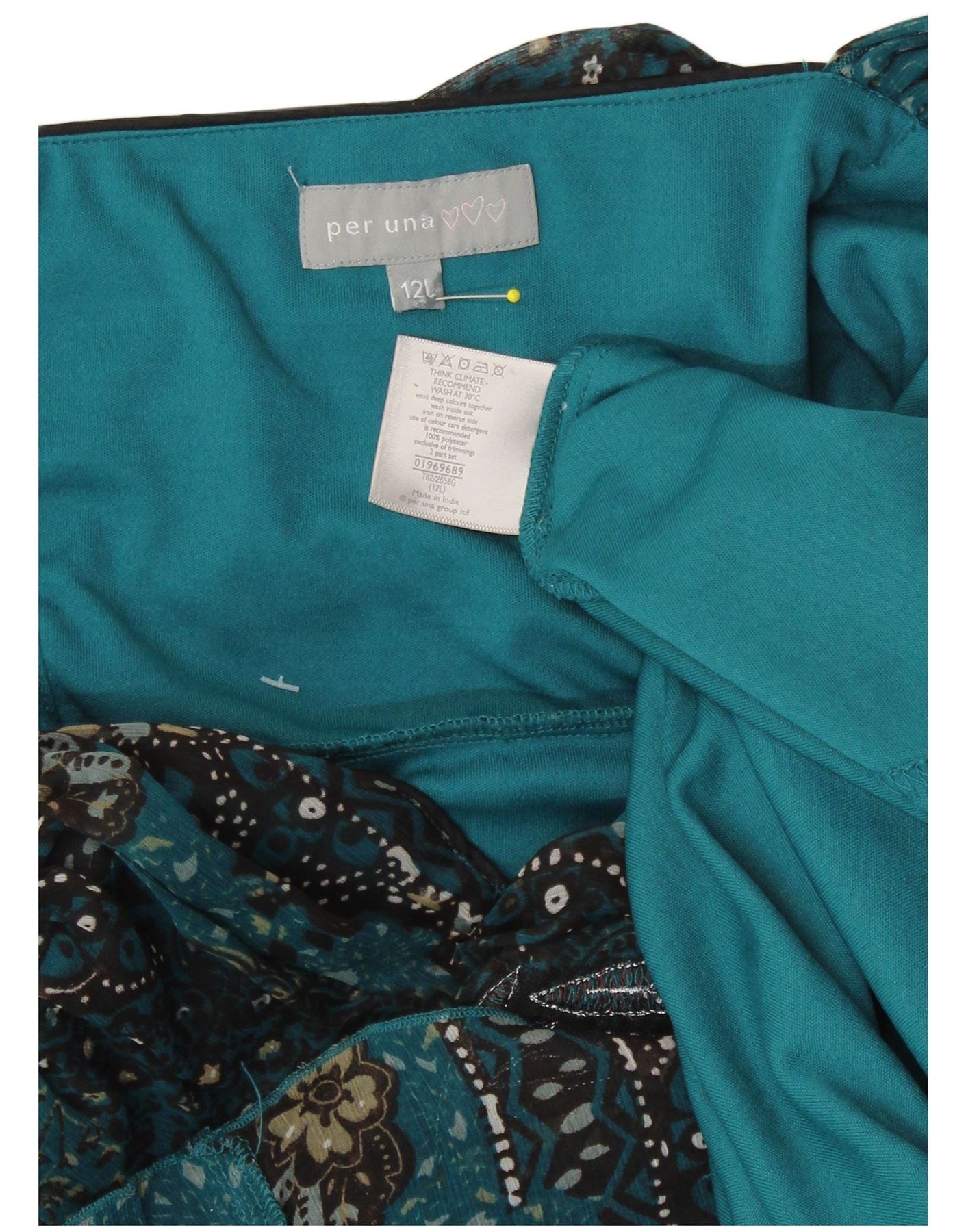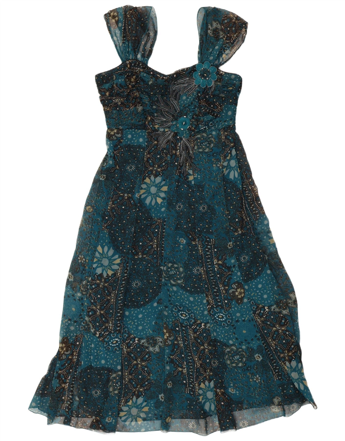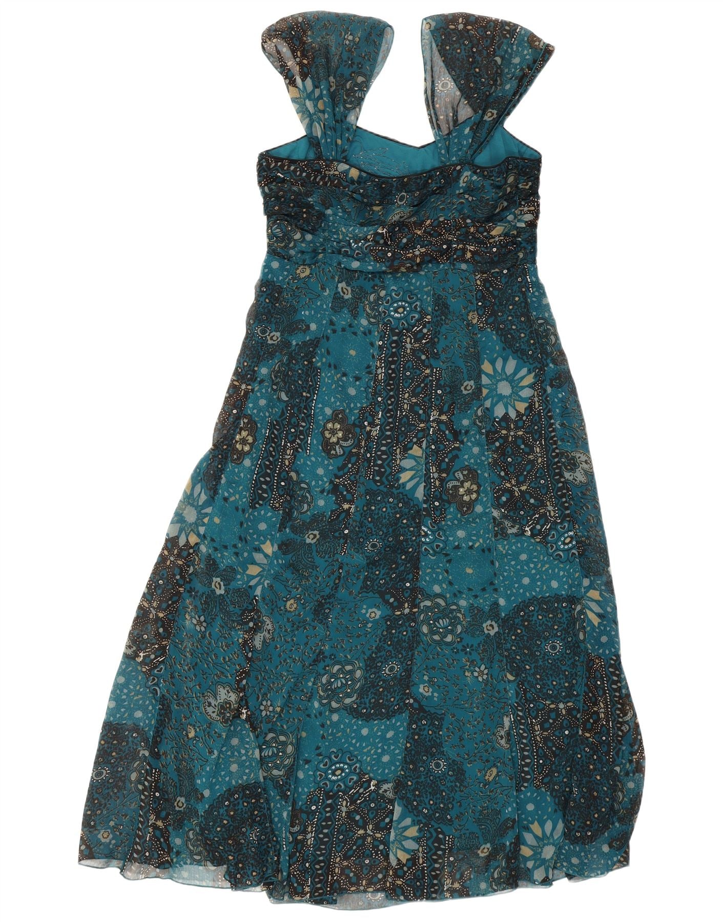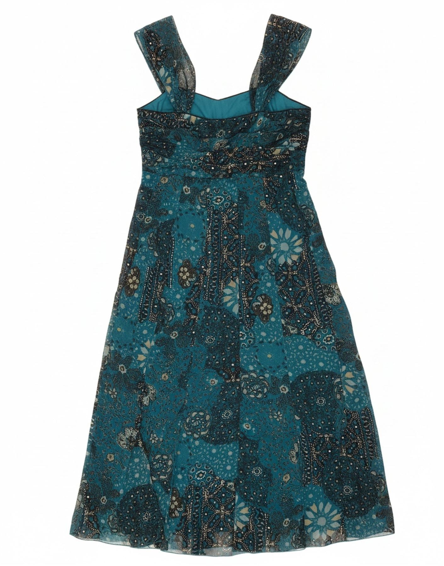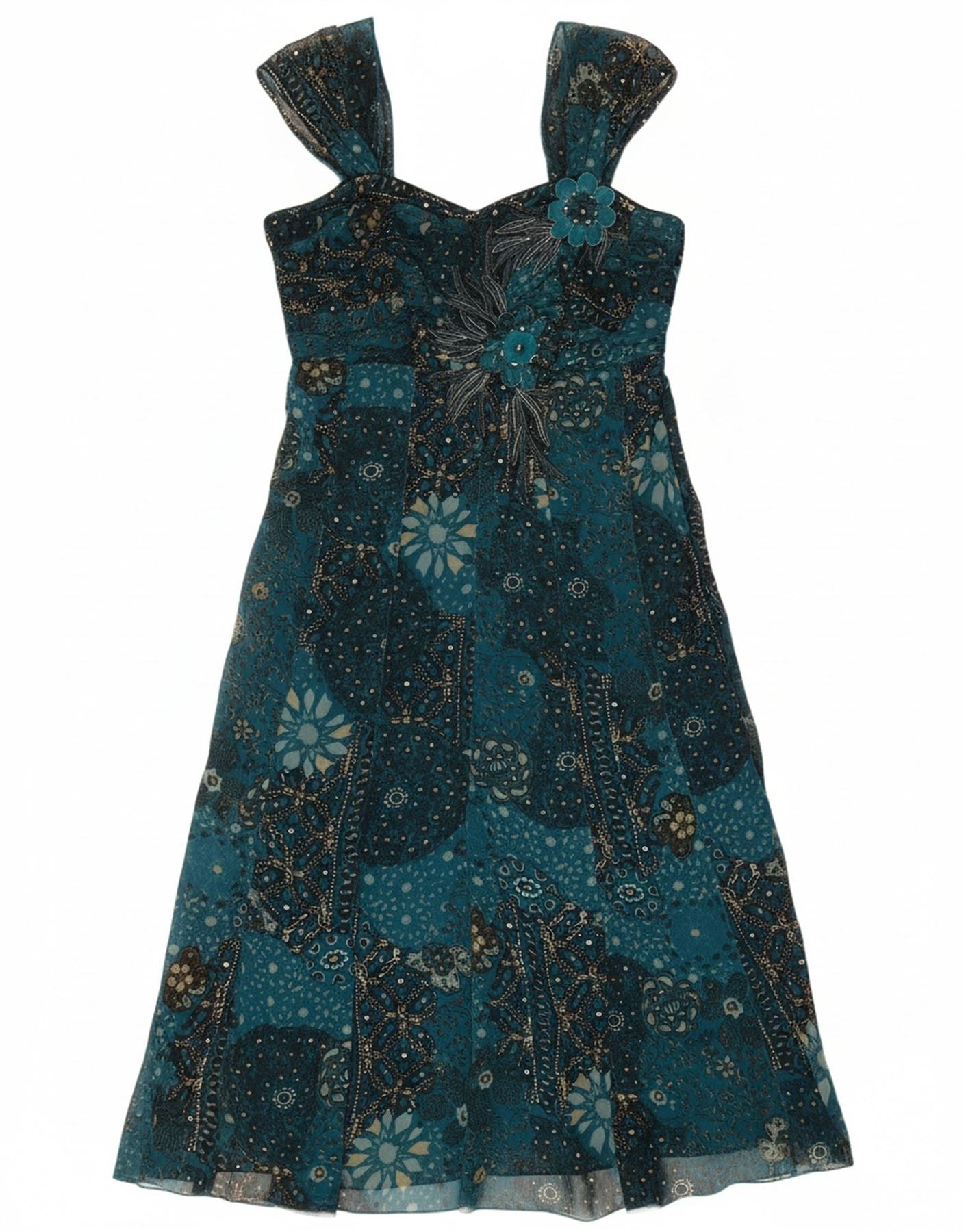 Vestido feminino PER UNA sem mangas evasê UK 12 poliéster floral azul médio