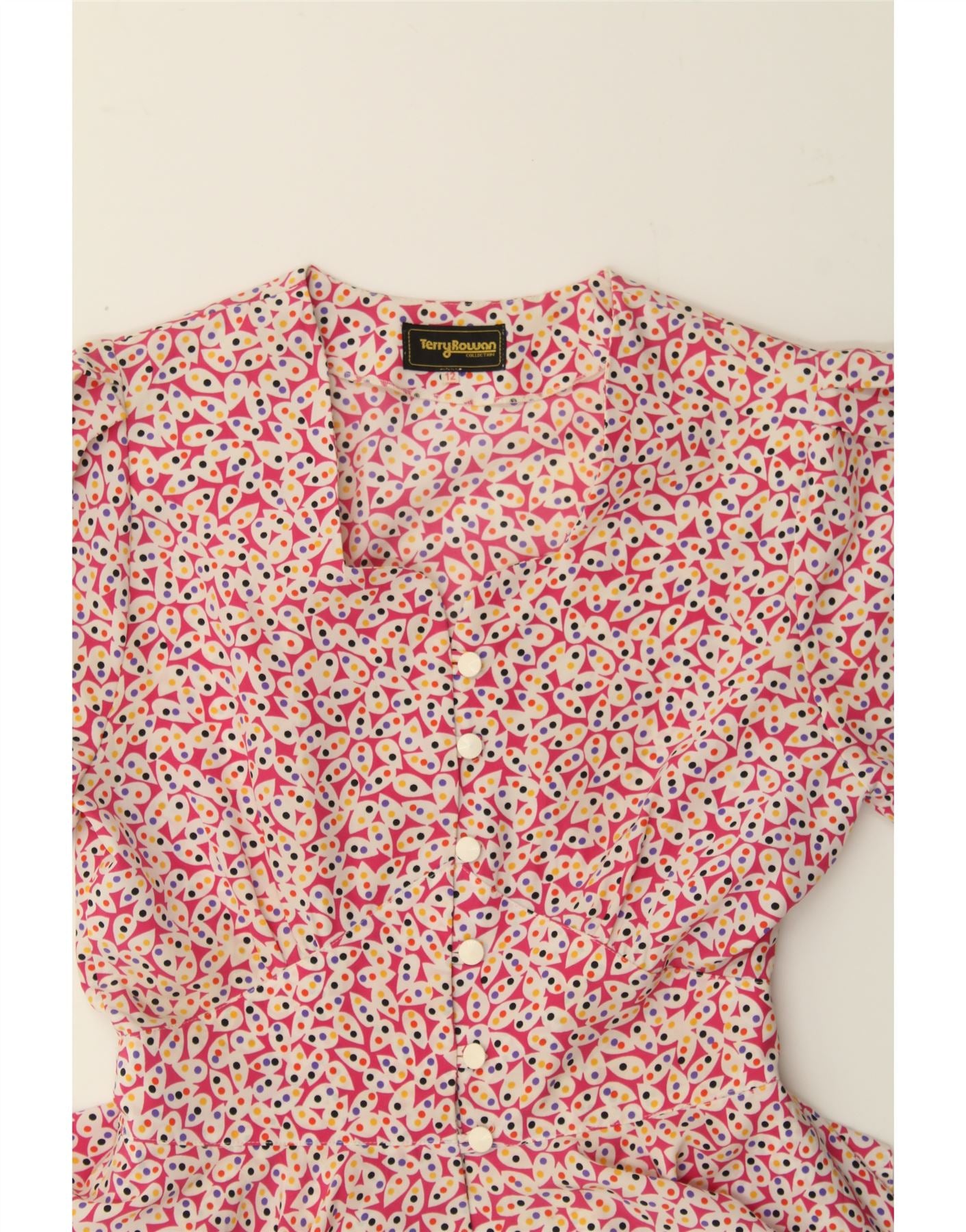 Vestido feminino VINTAGE com padrão abstrato Peplum UK 12 rosa médio