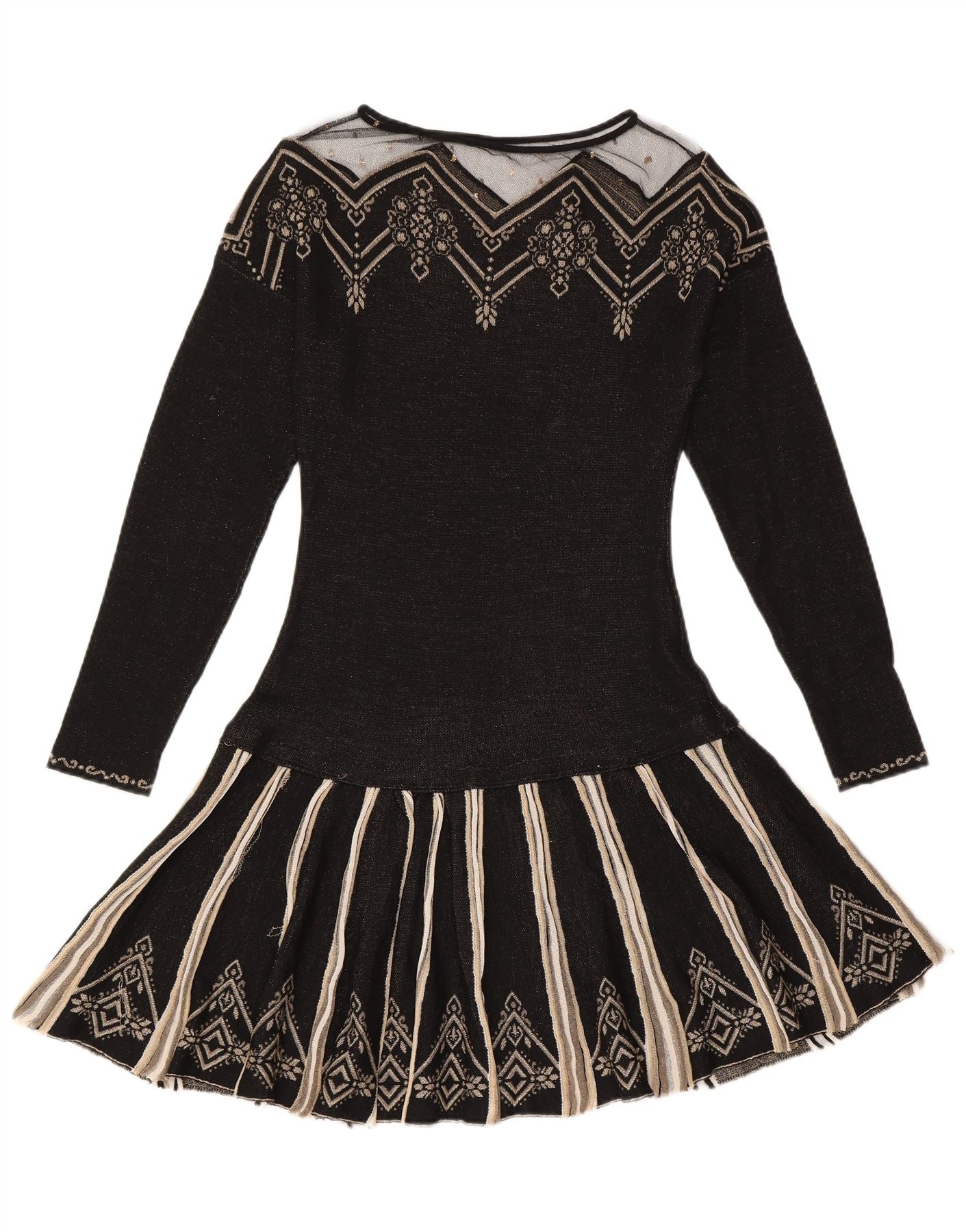 - Descrição da IA: Este vestido jumper feminino Just Cavalli é confeccionado em um confortável tecido de malha preta. Possui gola redonda clássica e mangas compridas. O design apresenta um padrão geométrico abstrato, sutilmente realçado com detalhes em lantejoulas. Em estilo pulôver, oferece um ajuste regular para uso sem esforço. Este vestido combina estrutura clássica com detalhes visuais marcantes.