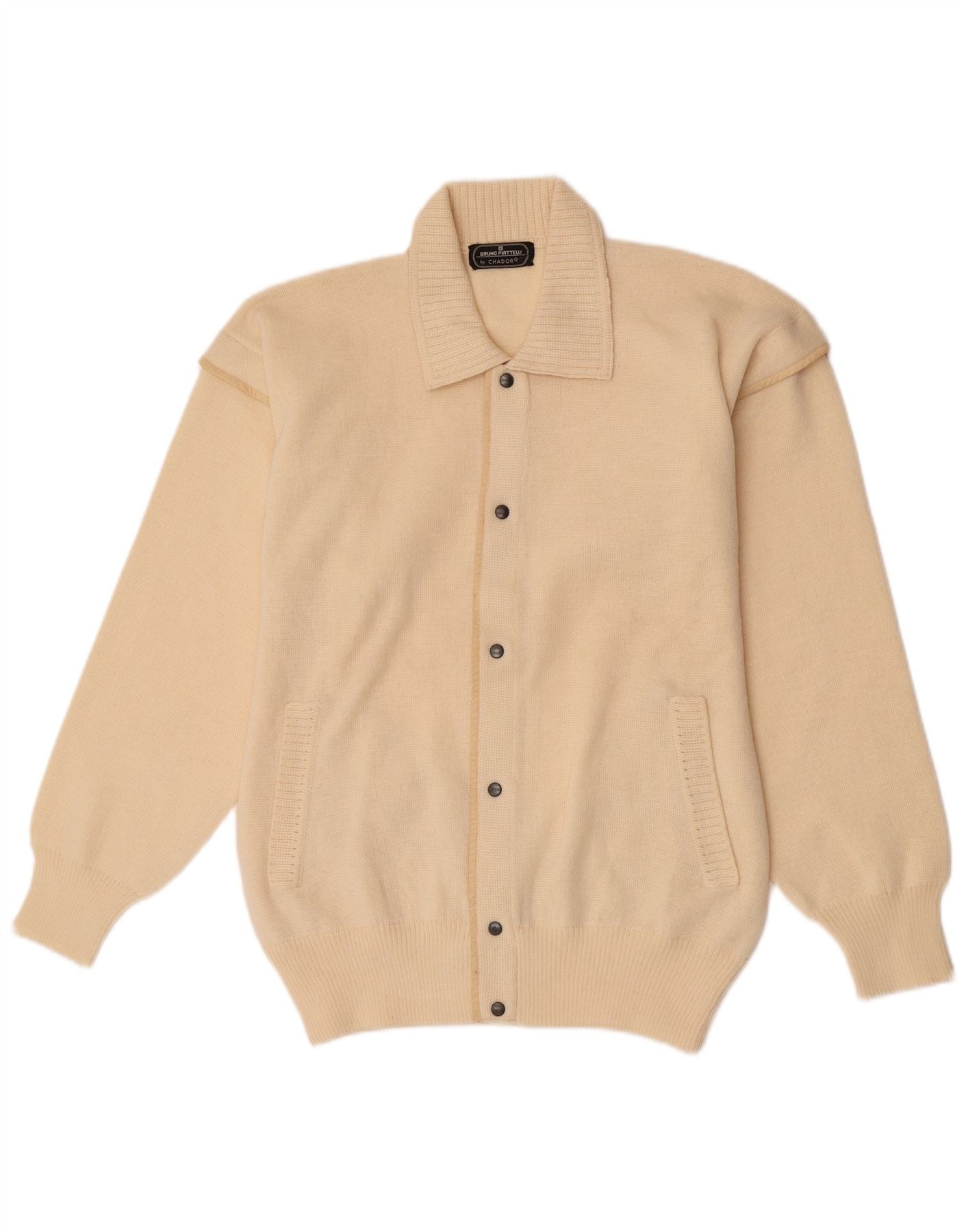 - Descrição da IA: Este suéter cardigã masculino Bruno Piattelli é confeccionado em malha 100% lã pura, oferecendo um toque macio e luxuoso em um tom bege quente. Possui decote clássico com gola e mangas compridas. O ajuste regular garante um uso confortável. Uma frente completa com botões tonais proporciona um fechamento perfeito. Bolsos frontais práticos acrescentam detalhes funcionais.