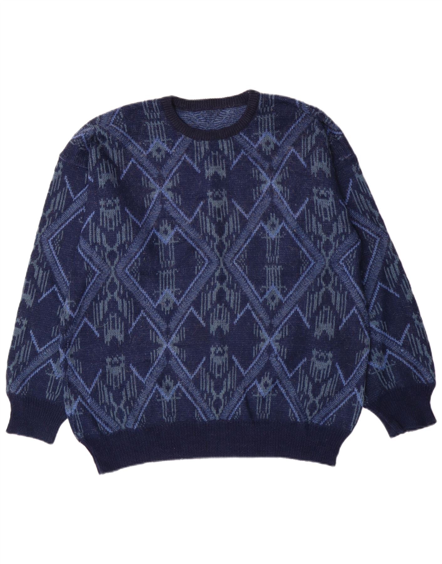 - Descrição da IA: Este suéter masculino Vintage é confeccionado em tecido de malha macia em um rico azul marinho. Possui um padrão geométrico impressionante tecido por toda parte, oferecendo profundidade visual. O clássico decote redondo e as mangas compridas proporcionam uma silhueta confortável e atemporal. Projetado para um ajuste regular, garante facilidade de uso e estilo versátil. Este estilo pulôver oferece camadas fáceis para qualquer ocasião.