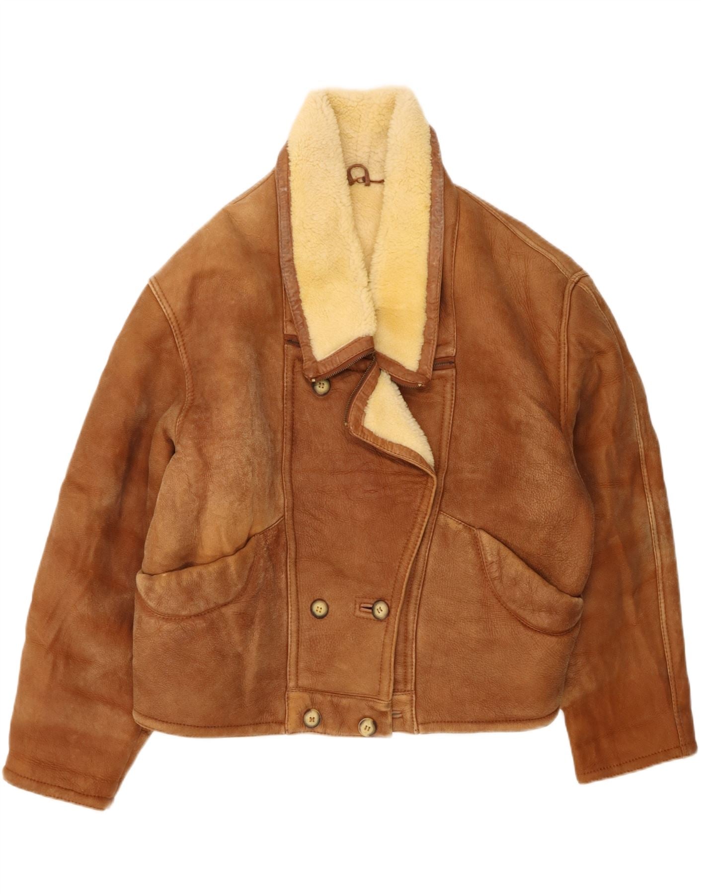 - Descrição da IA: Esta jaqueta vintage masculina de shearling é confeccionada em luxuoso shearling marrom, oferecendo excelente calor e um acabamento macio e texturizado. Possui decote clássico com gola e fecho de botão trespassado. Botões tonais complementam o matiz rico. Mangas compridas e corte descontraído garantem conforto e estilo atemporal. Bolsos práticos melhoram sua funcionalidade e apelo. Esta jaqueta forrada e pesada é ideal para climas mais frios, combinando design clássico com um toque premium.