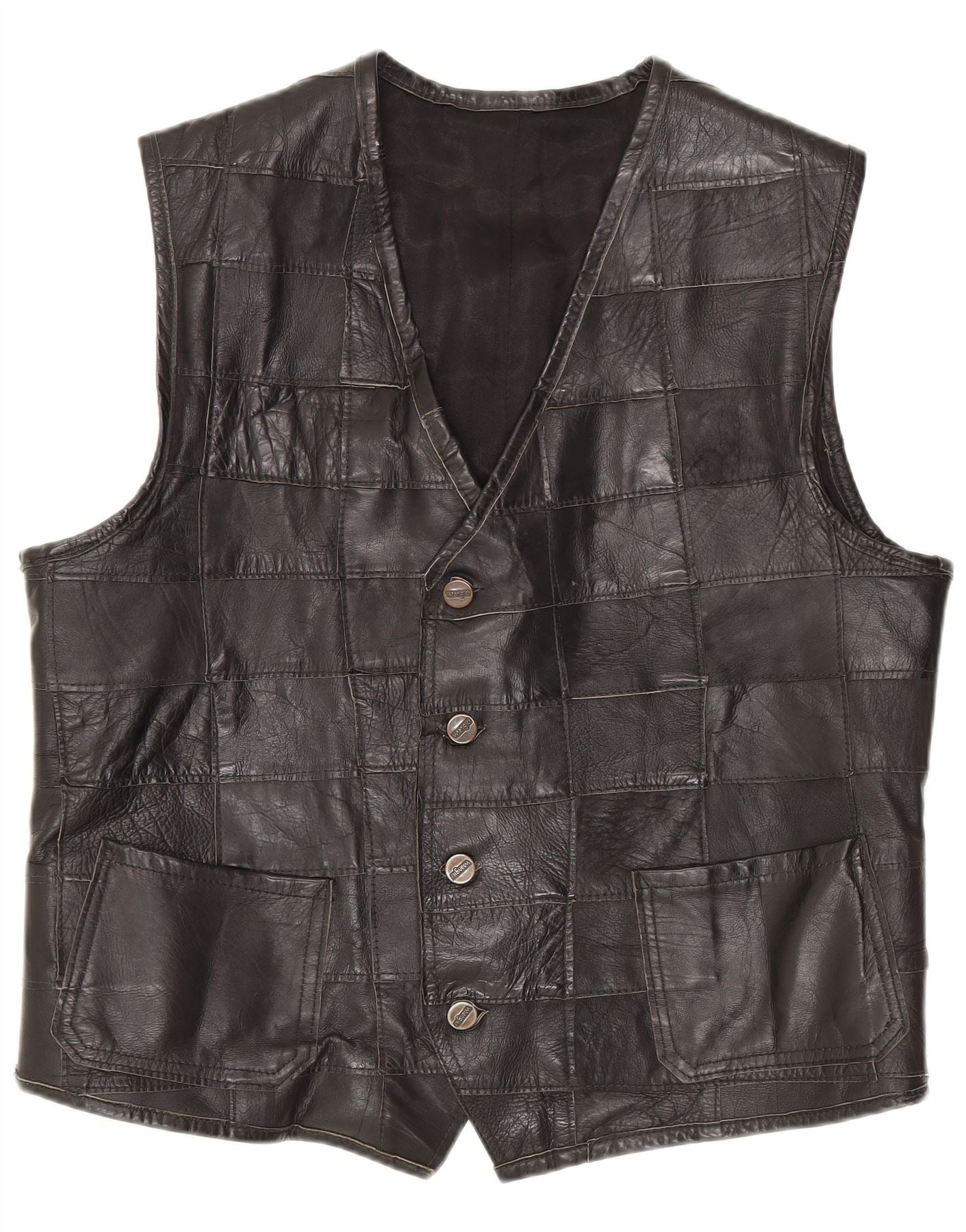 - Descrição da IA: Este colete masculino Vintage é feito de couro preto, apresentando um padrão distinto de patchwork. O design sem mangas e o decote em V oferecem uma silhueta clássica. Um botão frontal garante um fechamento seguro. O ajuste regular proporciona conforto e versatilidade. Bolsos práticos acrescentam detalhes funcionais a esta peça estilo motociclista.