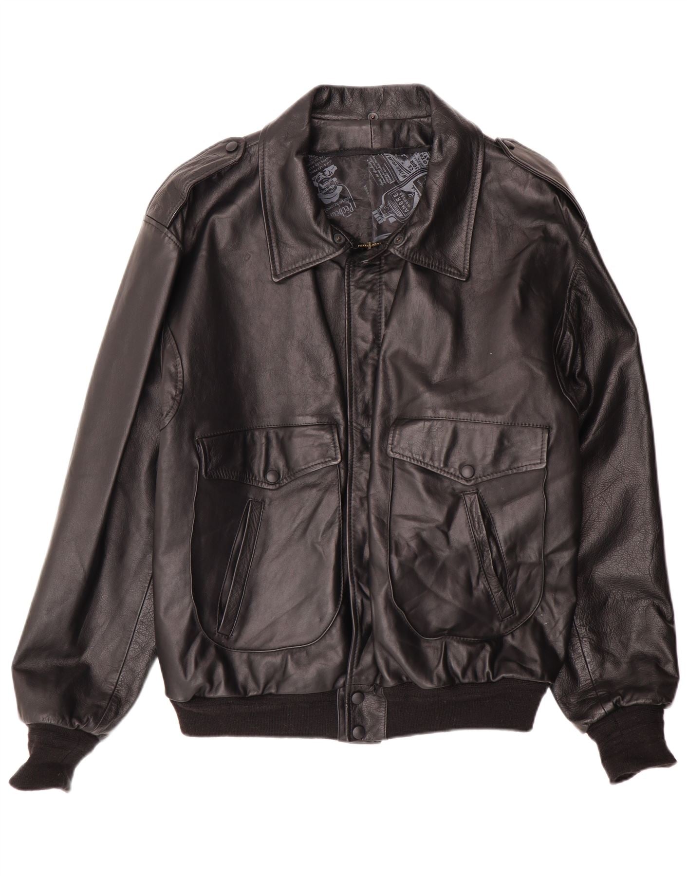 - Descrição da IA: Esta jaqueta bomber masculina Vintage é confeccionada em couro preto liso, exalando um estilo retrô clássico. Possui decote com gola e fecho de correr completo. As mangas compridas terminam com punhos canelados, complementando a bainha canelada. Dois grandes bolsos frontais com abas abotoadas proporcionam detalhes práticos. Dragonas nos ombros com detalhes em botões realçam sua aparência autêntica de aviador. O ajuste regular garante um uso confortável.
