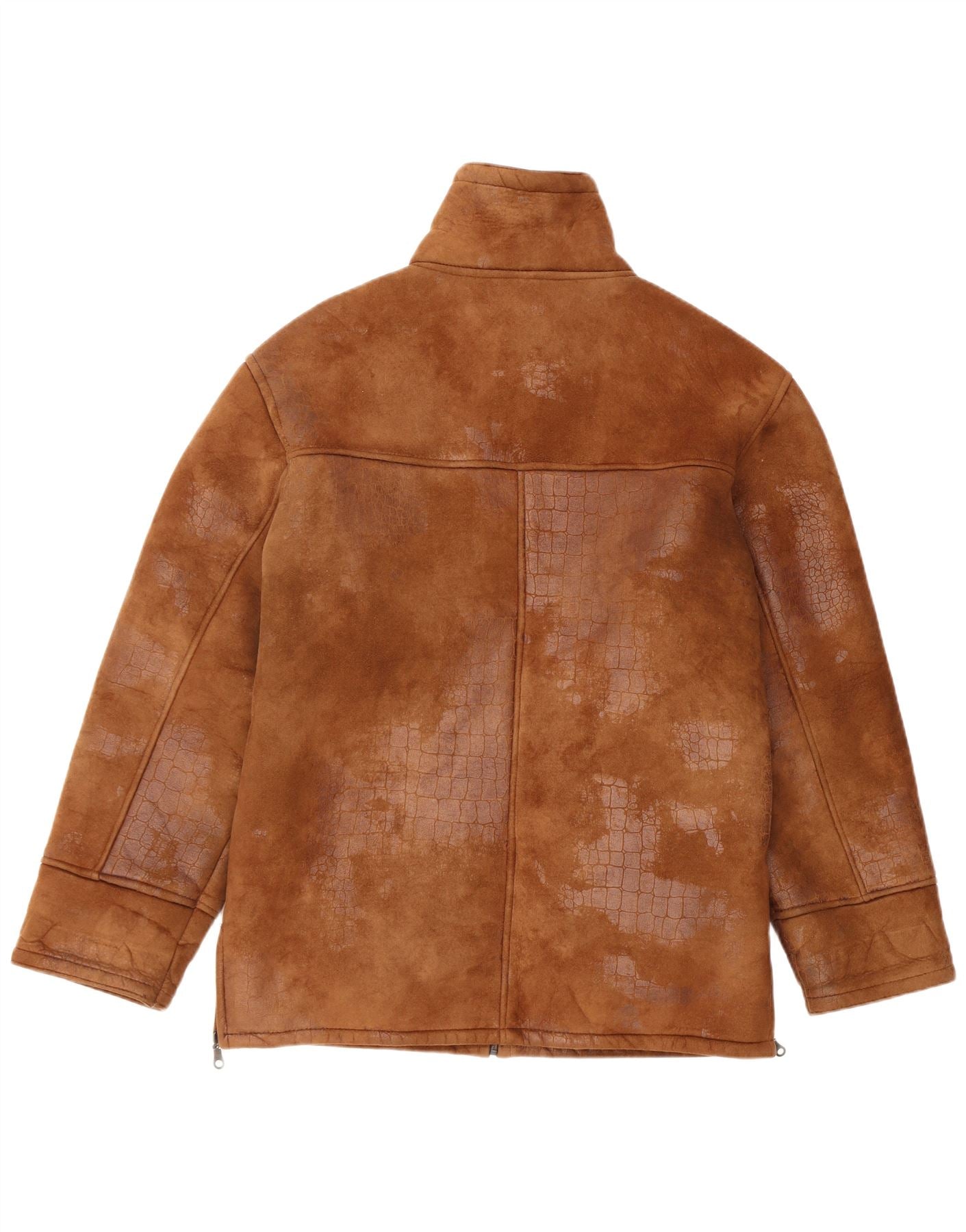 - Descrição da IA: Esta jaqueta masculina vintage de shearling oferece um tom marrom rico e um acabamento texturizado distinto. Feito de shearling luxuoso, apresenta um padrão de estampa animal em relevo para um apelo visual único. A gola alta e o fecho de correr completo proporcionam calor e um ajuste seguro. Mangas compridas e corte regular garantem conforto e estilo clássico. É totalmente forrado e inclui bolsos práticos, combinando o charme retrô com a funcionalidade do dia a dia.