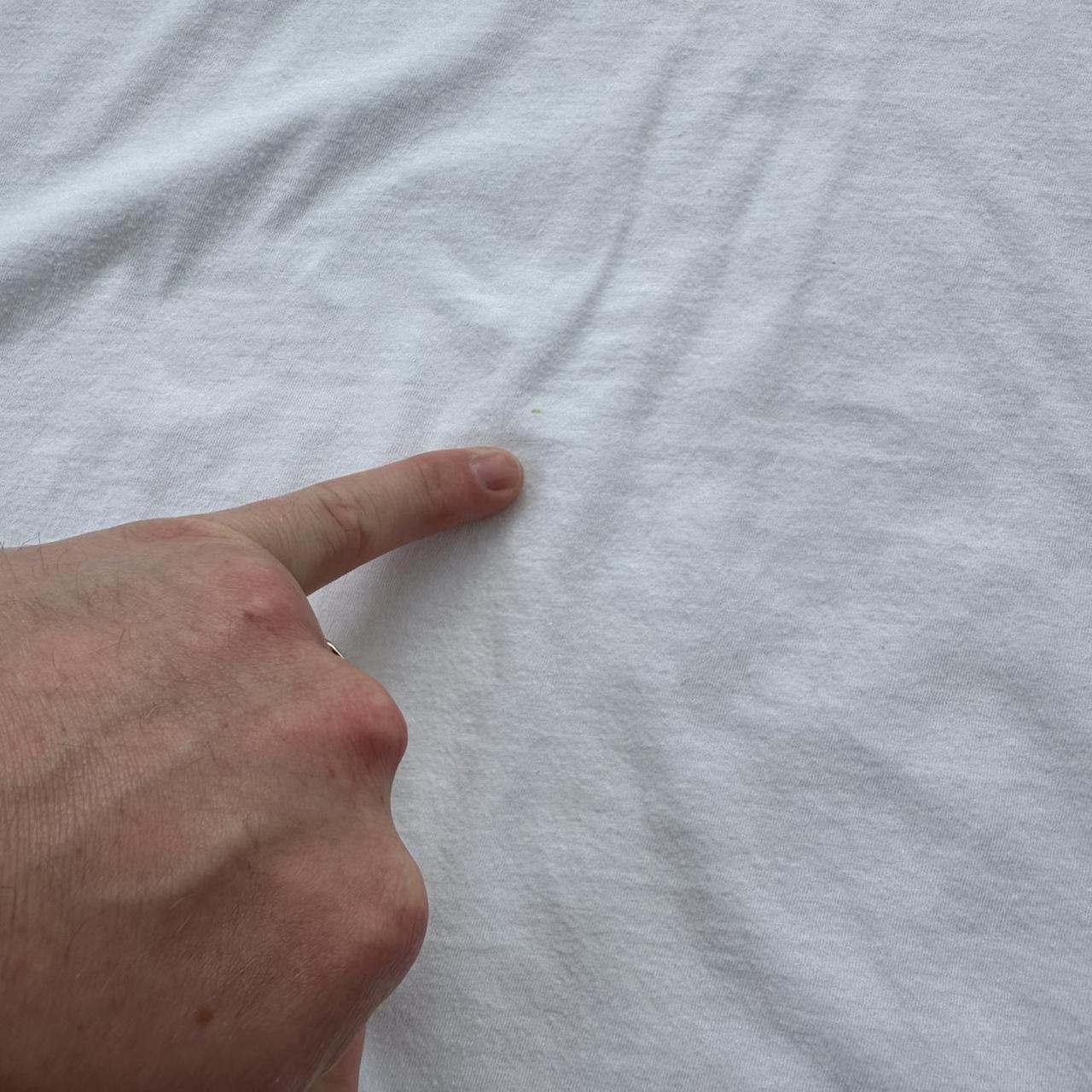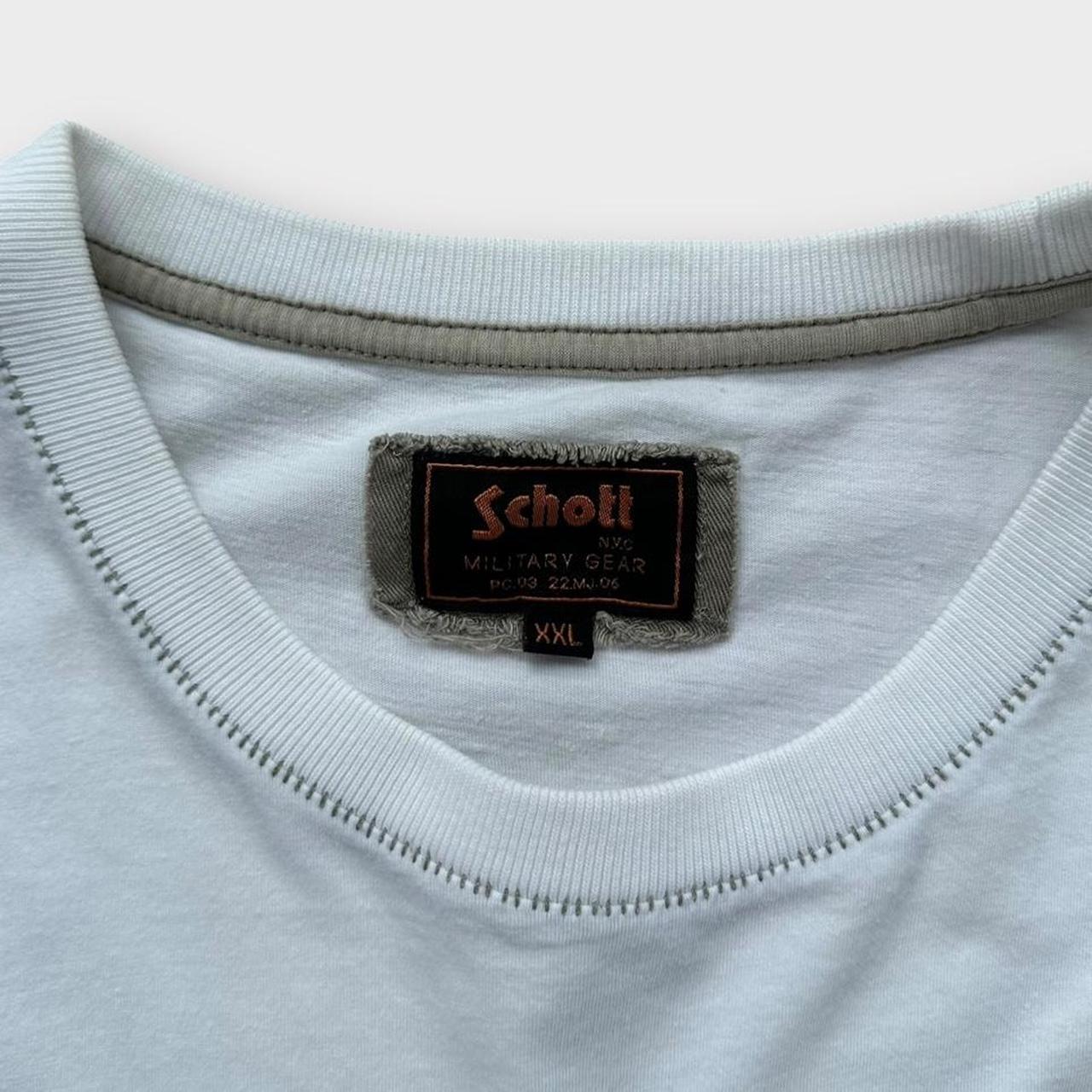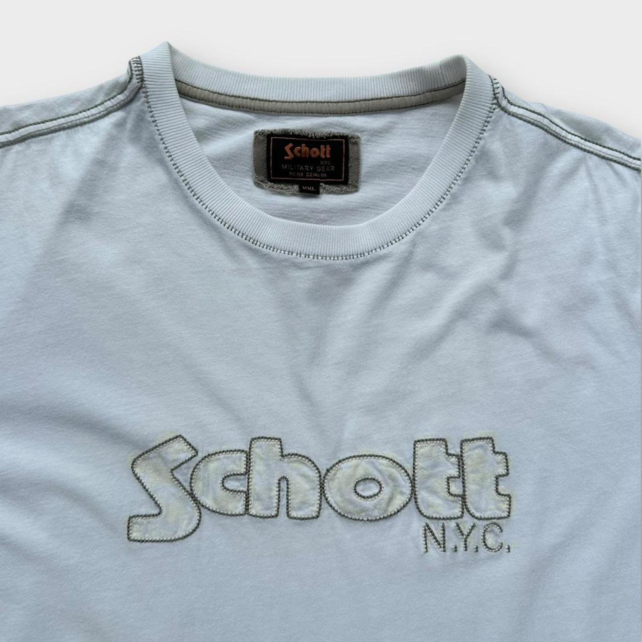 Camiseta Schott vintage do início dos anos 2000 em branco com feitiço estampado e bordado no peito