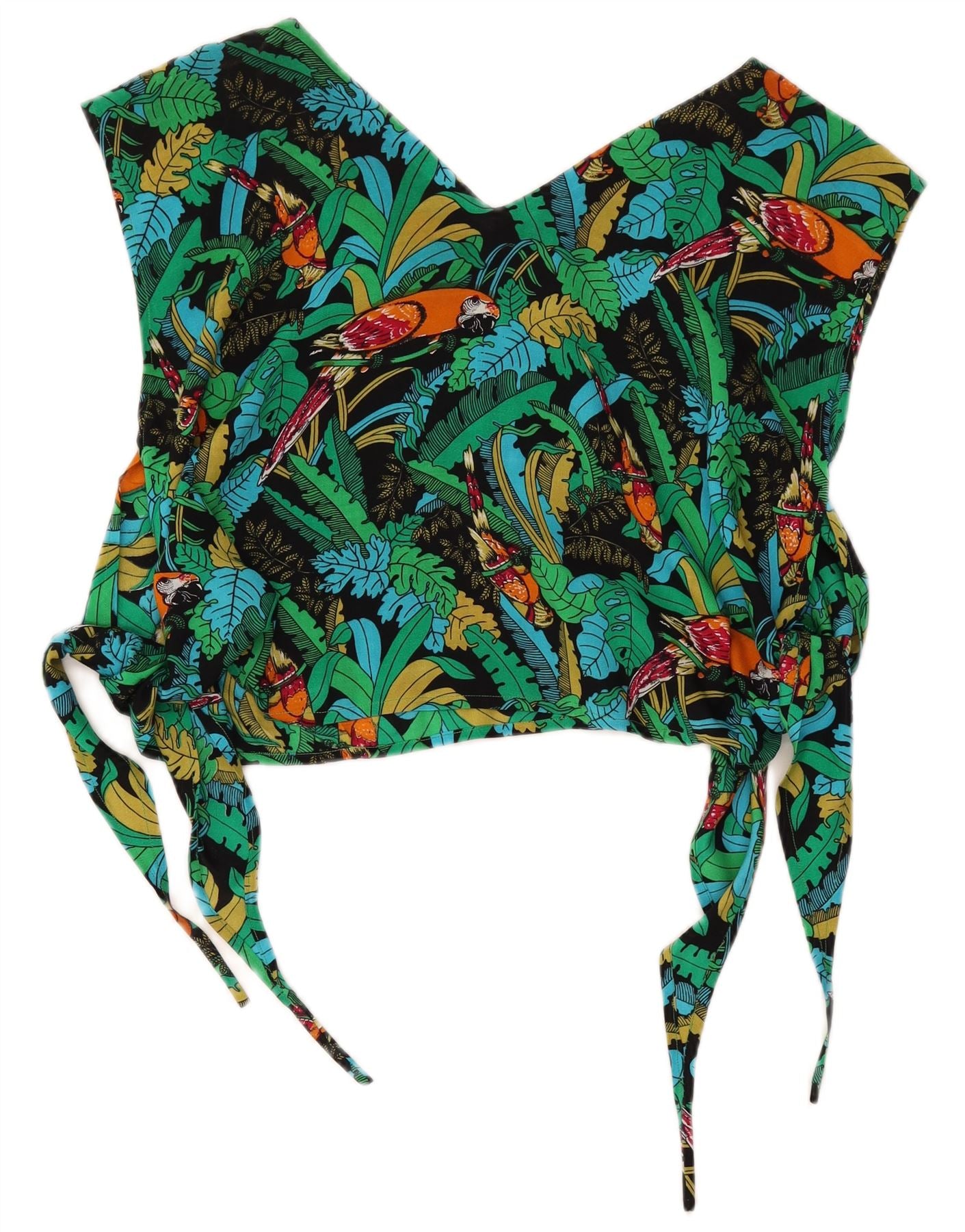 - Descrição da IA: Este top vintage feminino é feito de um tecido leve, com um padrão floral tropical multicolorido vibrante. Possui um decote em V lisonjeiro e um design sem mangas. O estilo envolvente cria um ajuste descontraído, preso com fecho de amarrar. Seu comprimento cropped acrescenta um toque moderno e estiloso, perfeito para um look de festival.