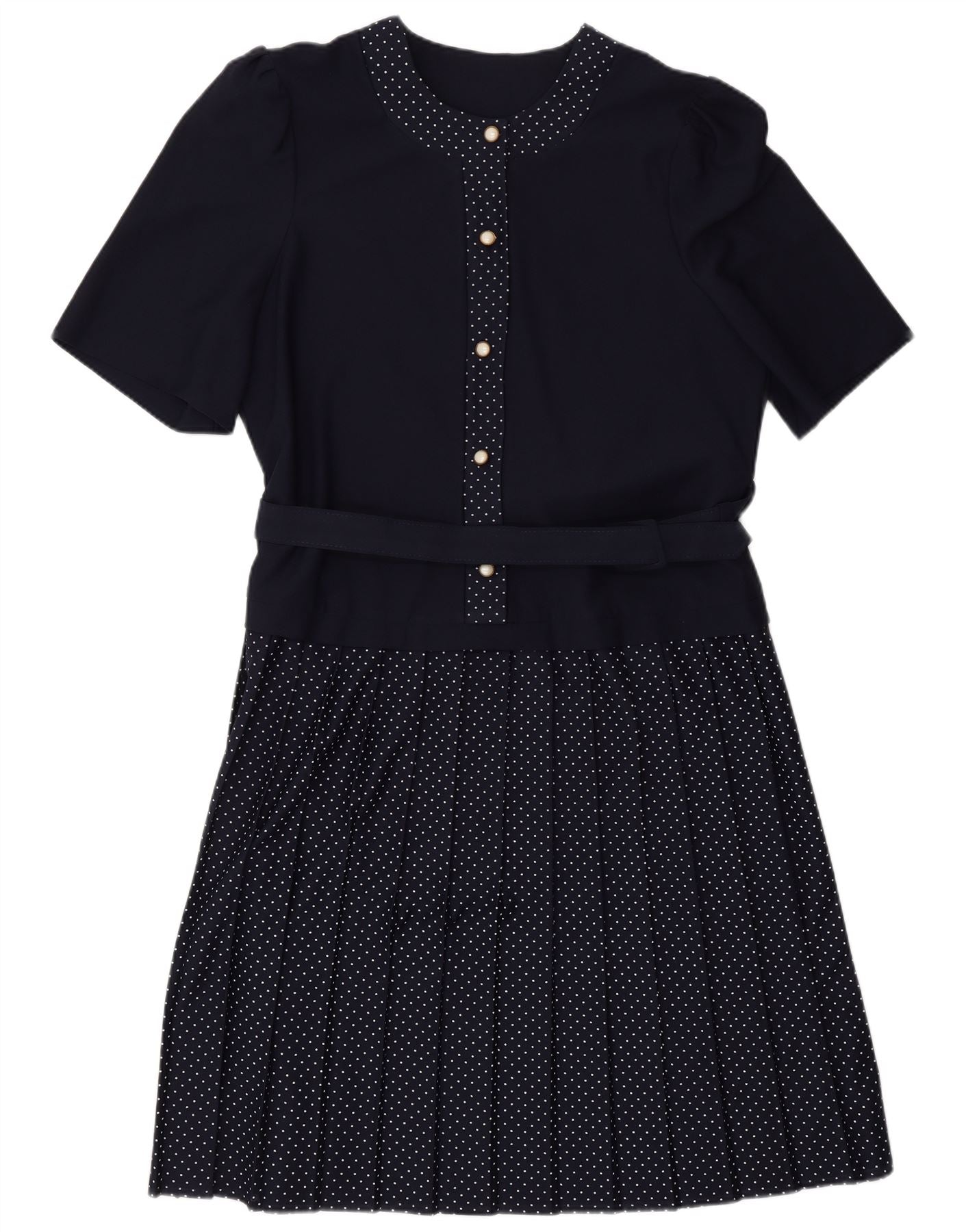 Vestido evasê feminino VINTAGE Reino Unido 16 grande poliéster manchado azul marinho