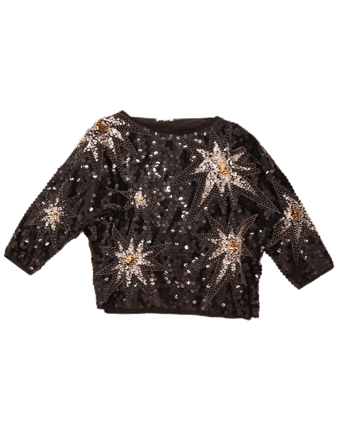 Blusa feminina VINTAGE com padrão abstrato manga 3/4 EU 42 grande preta