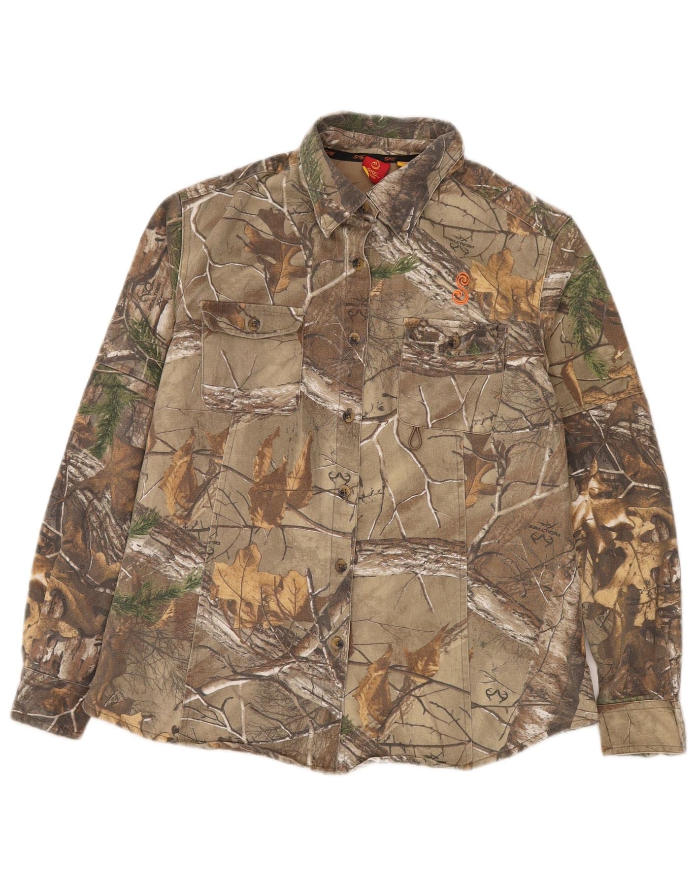 Camisa feminina VINTAGE com padrão abstrato Reino Unido 16 grande algodão cáqui colorido