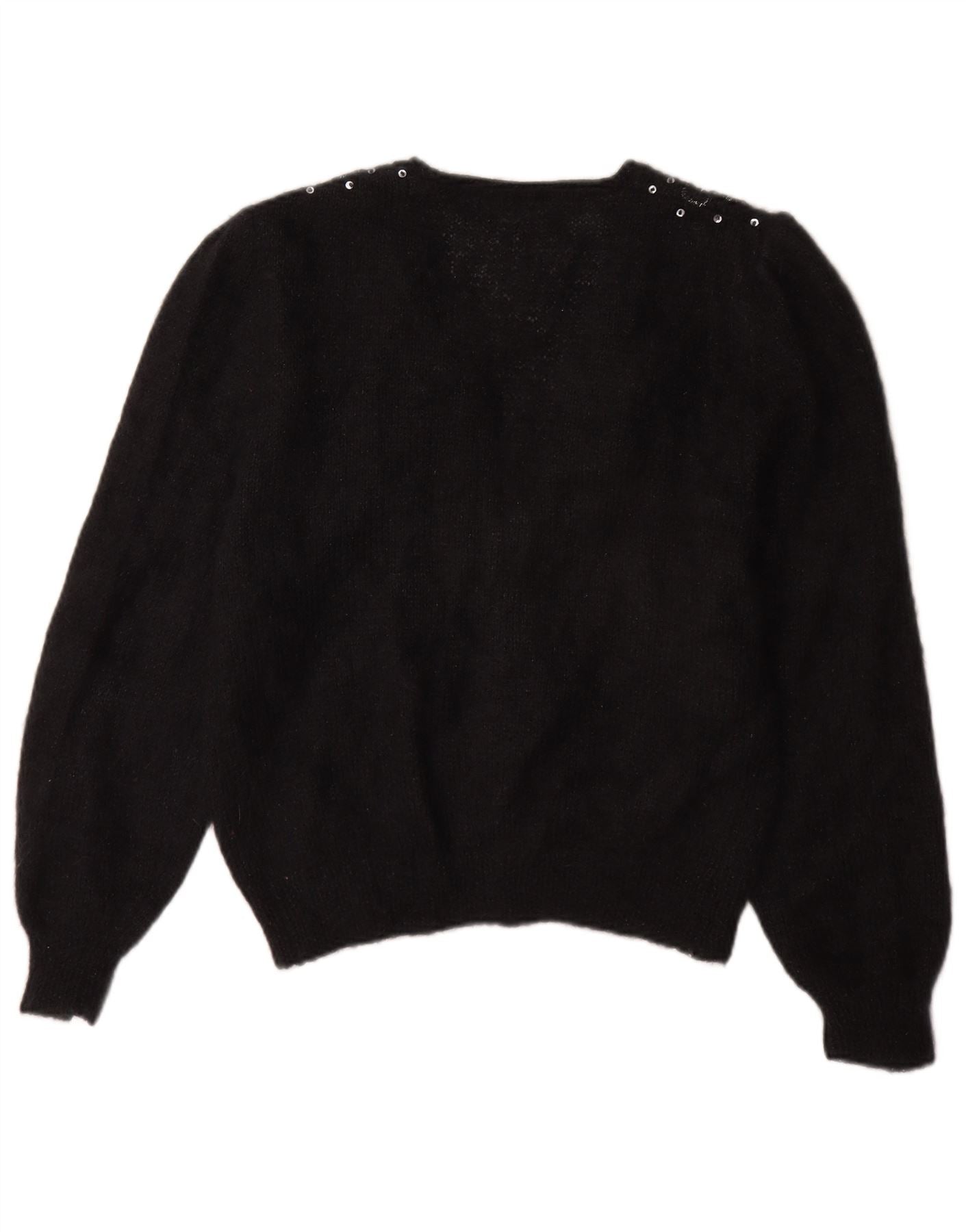 - Descrição da IA: Este suéter cardigã feminino vintage é feito de um tecido de malha preto macio. Possui decote em V clássico e botões frontais. As mangas compridas são bem algemadas para um acabamento refinado. O ajuste regular oferece um uso confortável. Acentos marcantes de lantejoulas adornam os ombros, adicionando um toque de brilho retrô. Esta peça combina estilo atemporal com detalhes elegantes.