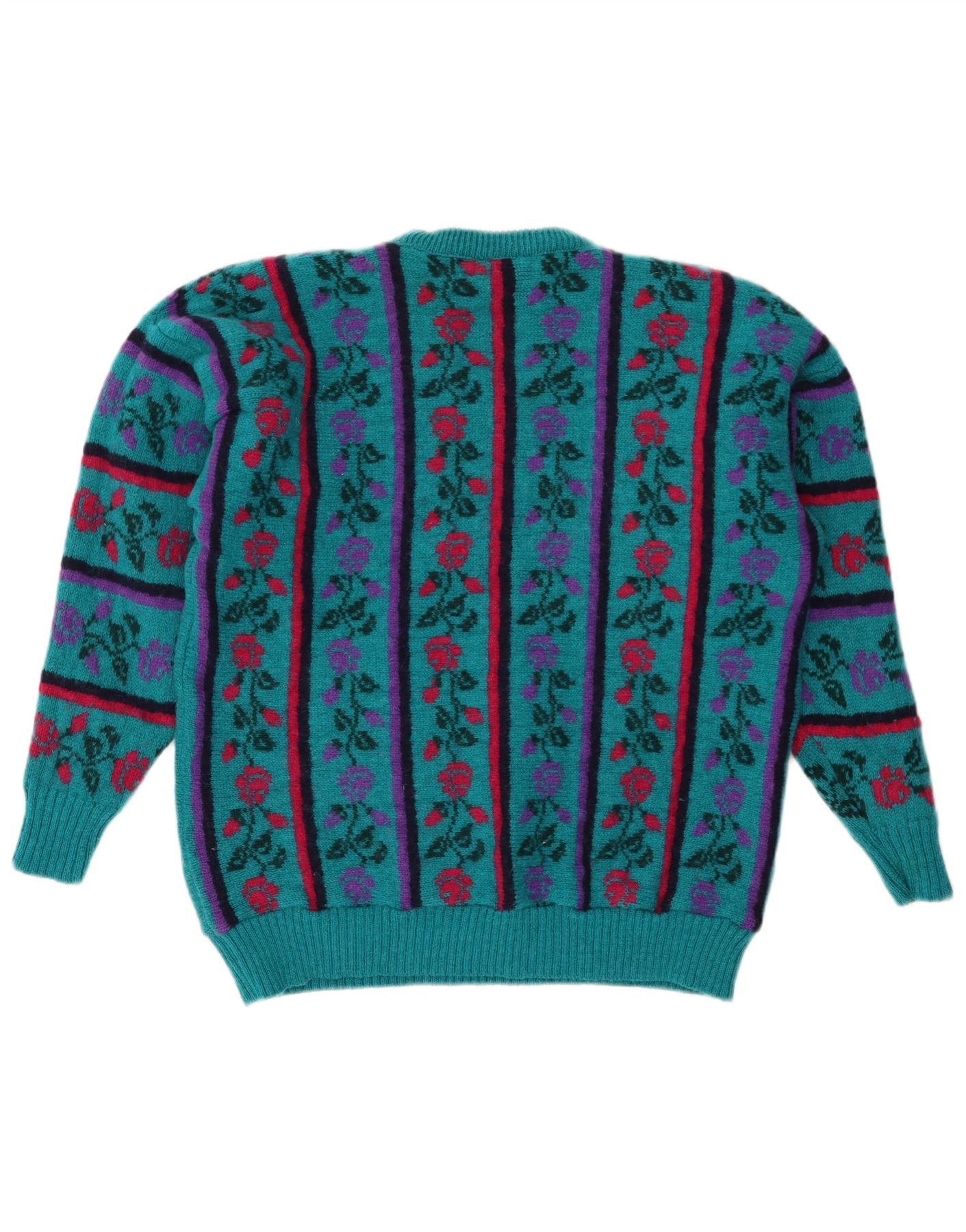 Suéter feminino VINTAGE com gola redonda Reino Unido 16 grande lã floral turquesa