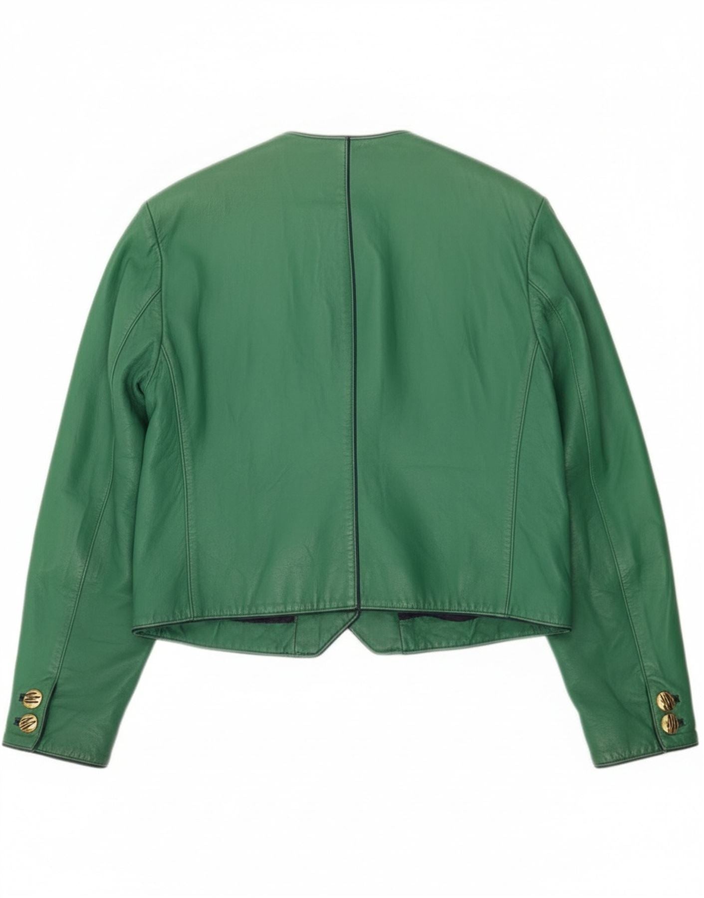 - Descrição da IA: Esta jaqueta de couro feminina Vintage é confeccionada em couro verde verdadeiro, oferecendo uma textura suave, mas flexível. Possui um forro confortável 100% acetato. A jaqueta possui um corte clássico com decote redondo. Mangas compridas proporcionam cobertura total. Aperta com elegantes fechos de botões. Bolsos funcionais acrescentam praticidade. Os detalhes dos botões realçam seu apelo vintage.