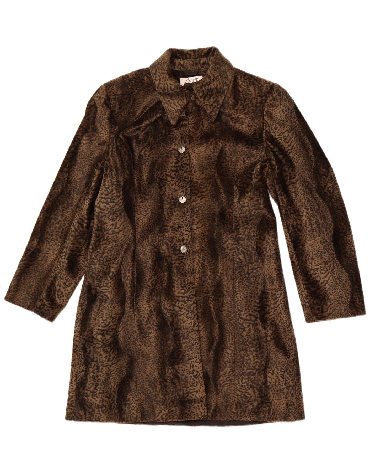 Sobretudo feminino VINTAGE de pele sintética Reino Unido 14 poliéster marrom médio com estampa animal
