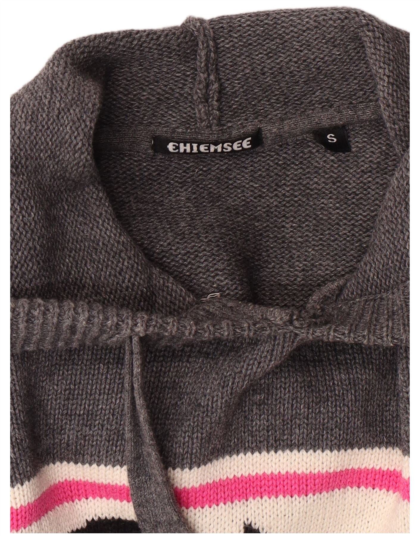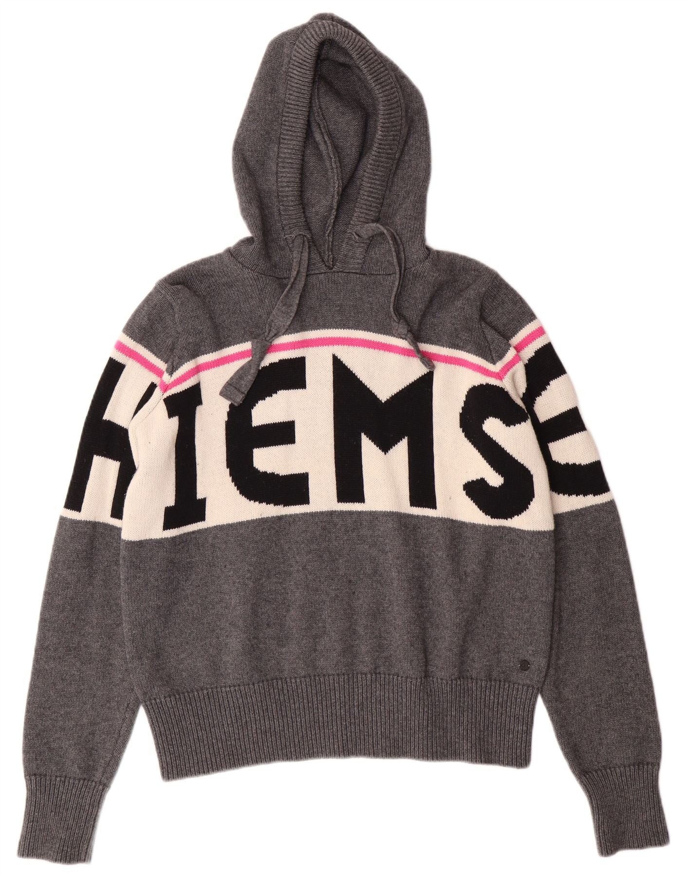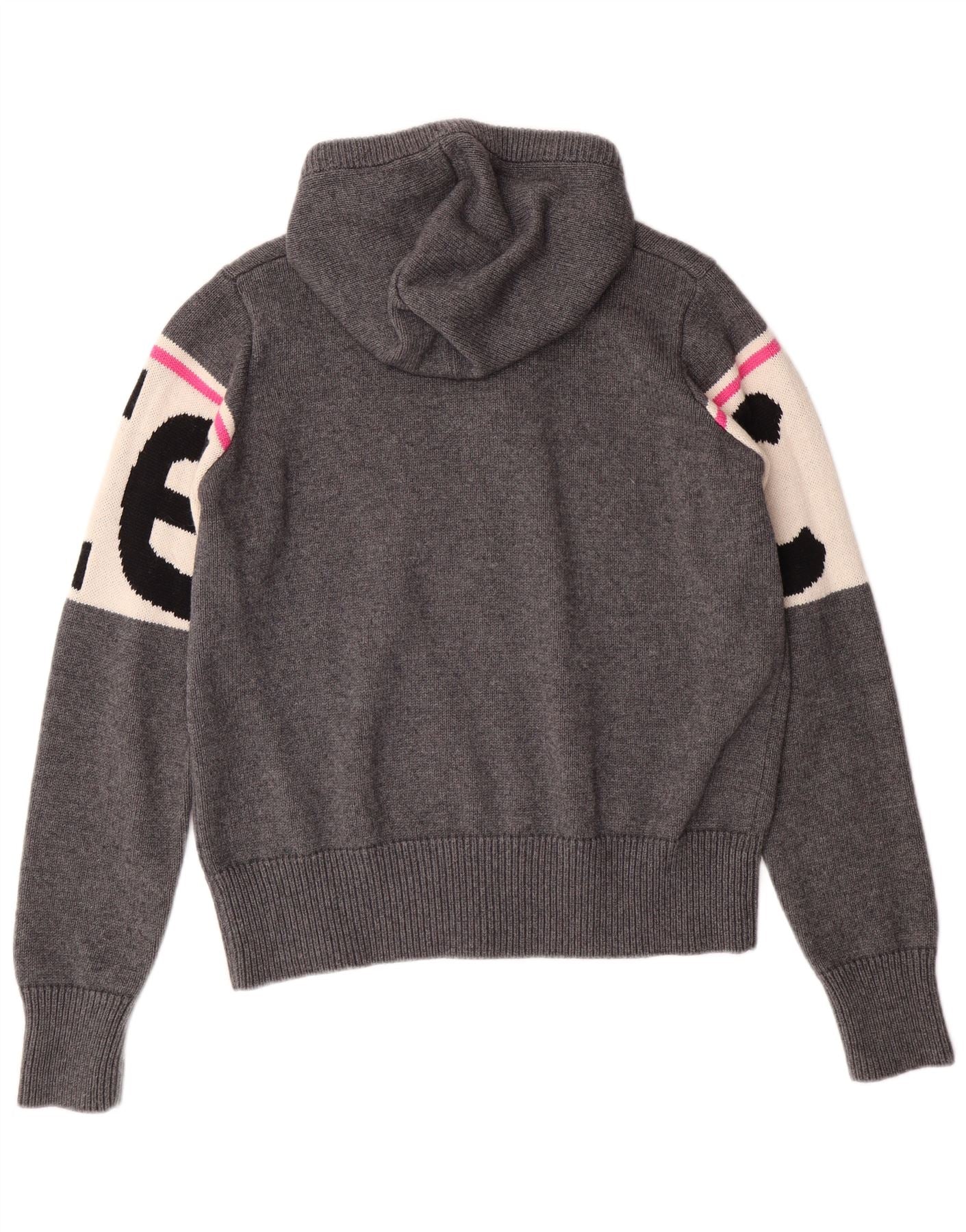 Suéter feminino VINTAGE com capuz gráfico Reino Unido 10 bloco colorido cinza pequeno
