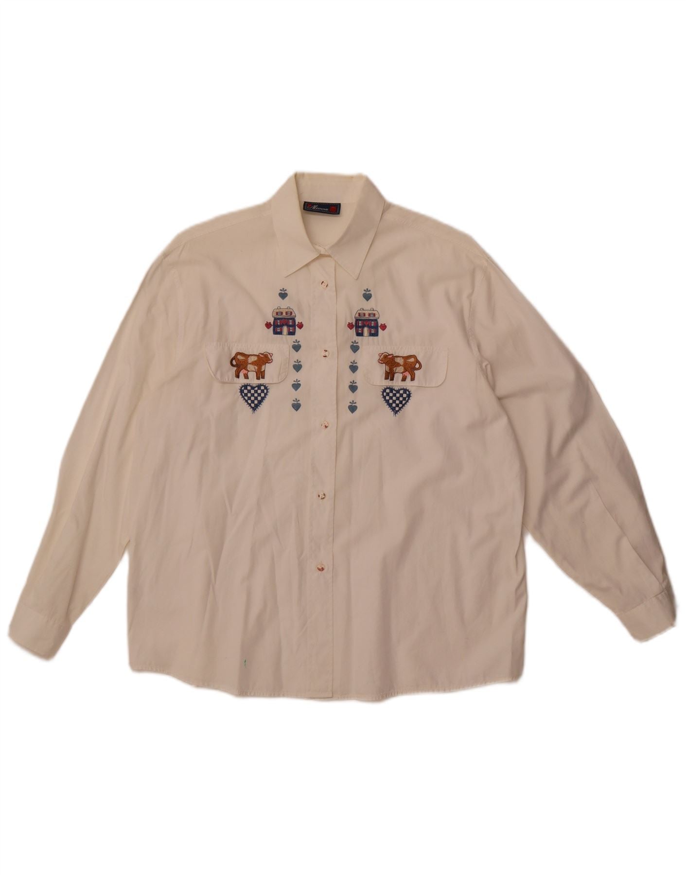 - Descrição da IA: Esta camisa feminina Alcova é confeccionada em algodão macio e esbranquiçado. Possui decote clássico com gola e botões frontais completos. As mangas compridas terminam com punhos simples. O ajuste regular oferece um uso confortável. Detalhes gráficos bordados distintos adornam a frente, incluindo motivos de animais e corações estampados. Dois bolsos no peito acrescentam estilo prático. Esta peça de inspiração retro combina conforto com um interesse visual único.