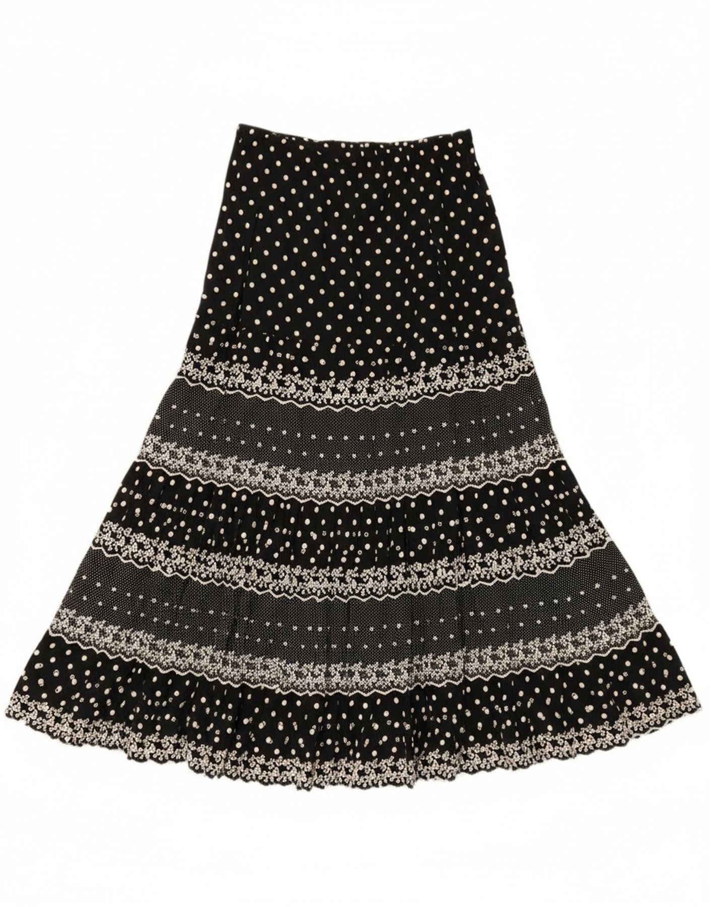 - Descrição da IA: Esta saia maxi feminina vintage é confeccionada em tecido rayon preto macio. Possui um encantador padrão de bolinhas por toda parte. Painéis em camadas apresentam detalhes bordados intrincados e padrões abstratos, adicionando profundidade visual. O estilo boêmio é evidente em seu design fluido. Um ajuste confortável na cintura garante um ajuste fácil e regular. O comprimento maxi cria uma silhueta elegante e descontraída.