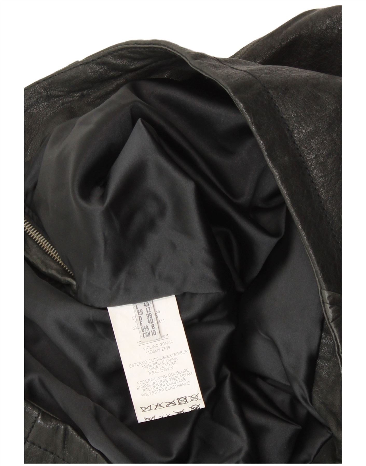 Saia feminina de couro VINTAGE Reino Unido 12 médio W30 couro preto patchwork