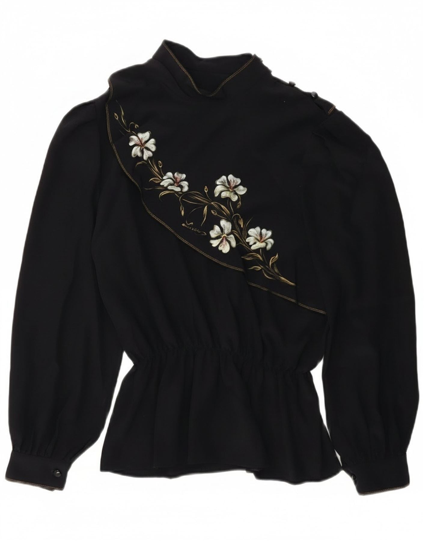 Blusa feminina vintage de manga comprida UK 14 médio azul marinho floral