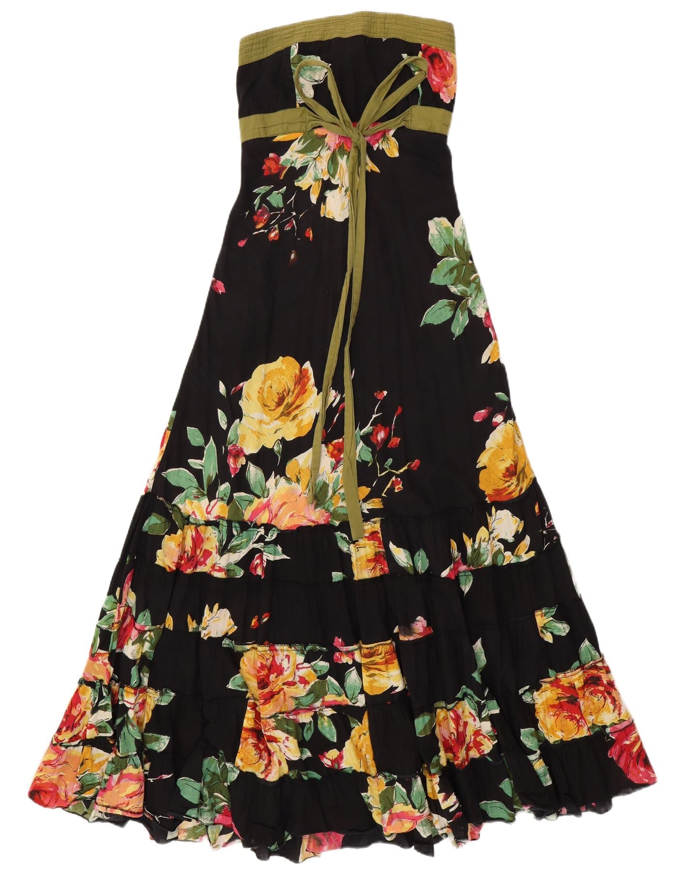Vestido maxi feminino VINTAGE sem alças Reino Unido 14 algodão floral preto médio
