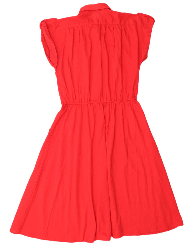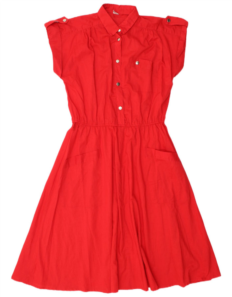 - AI Description: This Vintage womens shirt dress is presented in a rich red woven fabric. It features a classic collared neckline and short sleeves. The button-up front and empire waist create a flattering silhouette. An elasticated waist ensures a comfortable regular fit. Practical pockets add functionality. This retro-inspired piece offers timeless charm and effortless style.