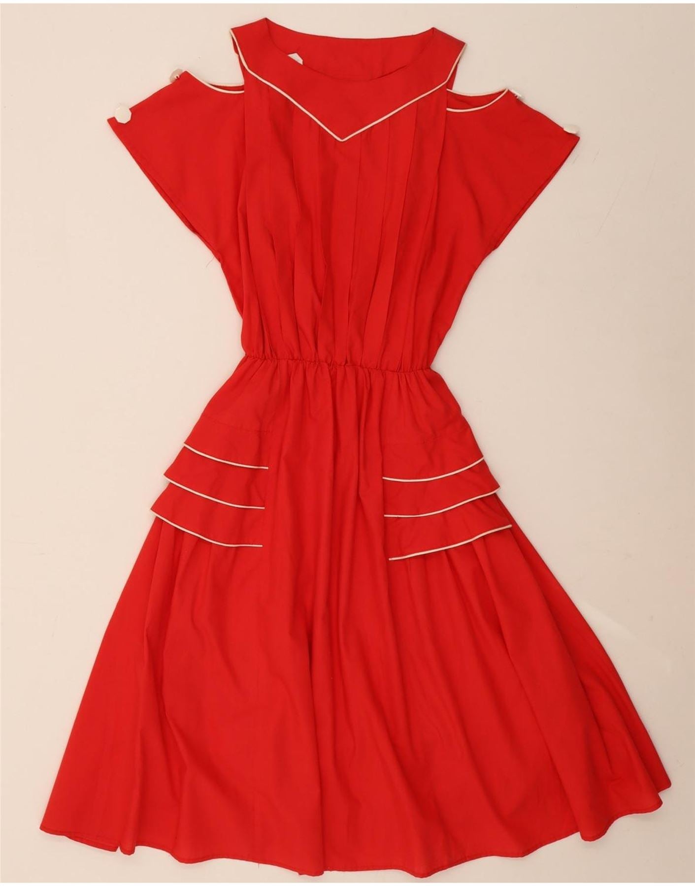 - Descrição da IA: Este vestido vintage feminino sem ombros é feito de um tecido liso vermelho misturado, uma mistura confortável de viscose e poliéster. Possui decote em V e mangas curtas elegantes. O corpete tem pregas delicadas, resultando em cintura elástica. O debrum branco acentua o decote e os painéis da saia em camadas. O ajuste regular oferece uma silhueta lisonjeira. Este vestido pulôver combina charme retrô com detalhes modernos para um visual distinto.
