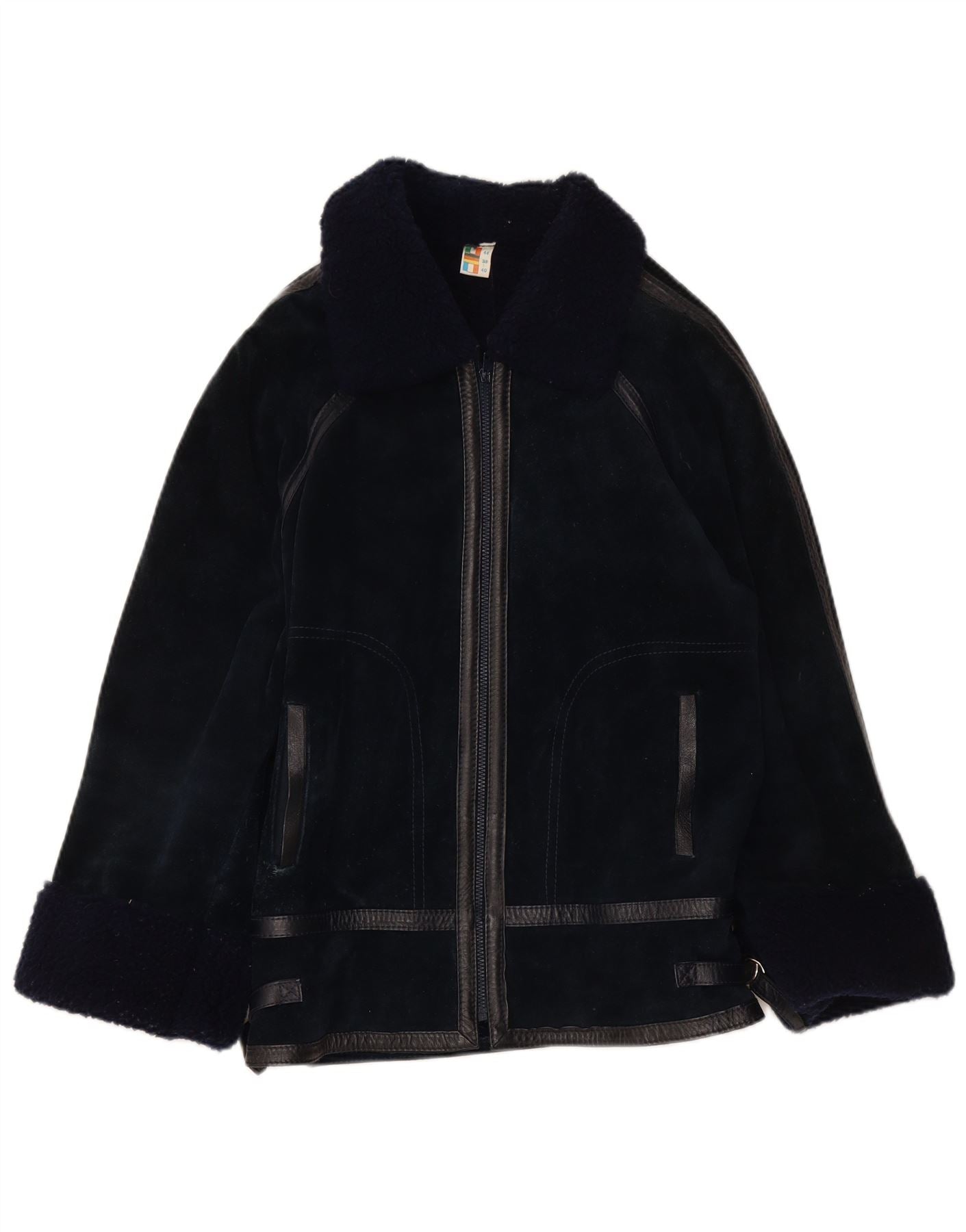 Jaqueta feminina VINTAGE de shearling IT 44 couro azul marinho médio
