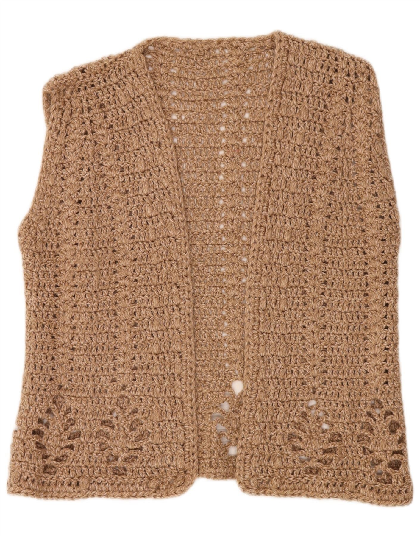 Suéter cardigã feminino de crochê sem mangas VINTAGE Reino Unido 14 grande bege