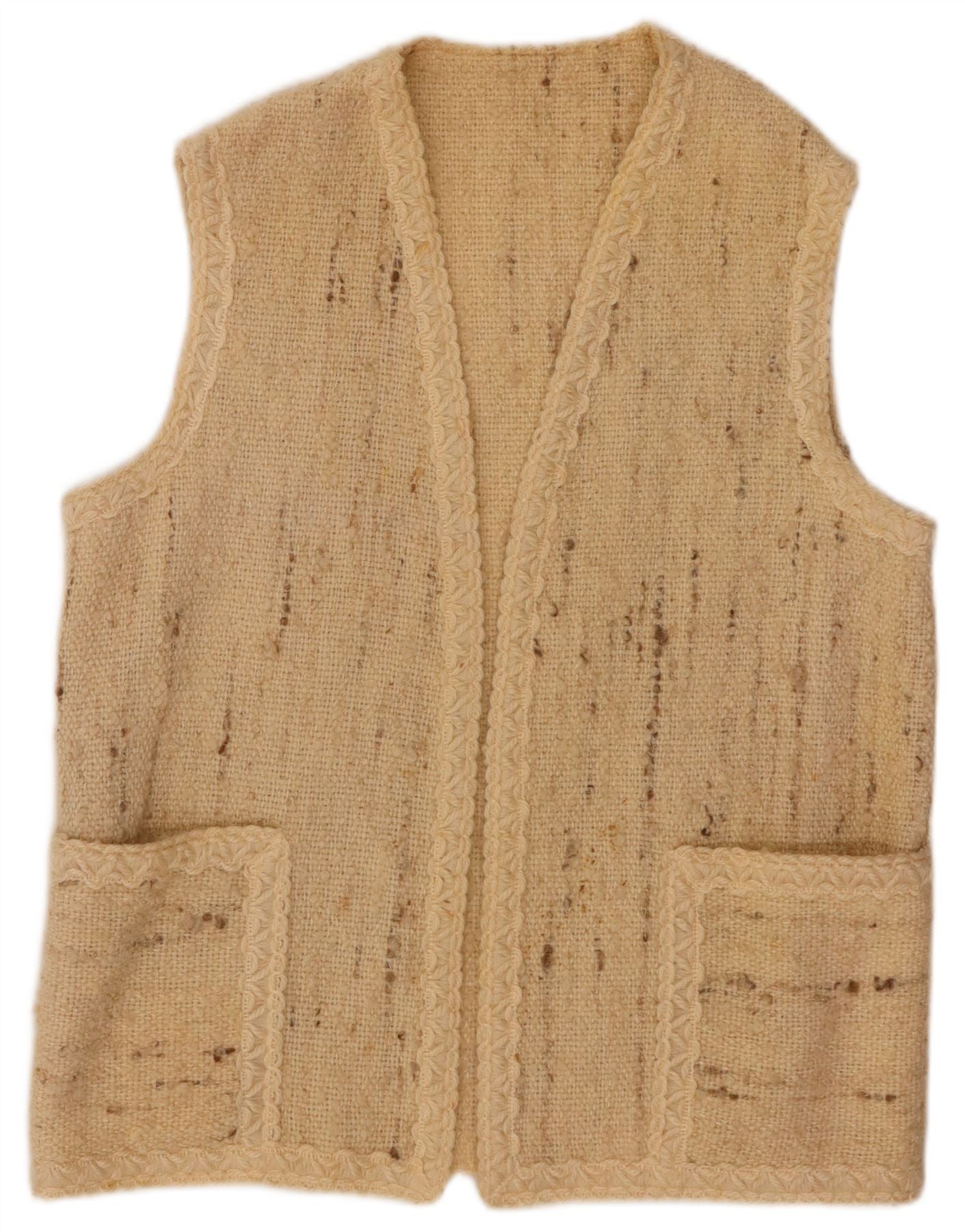 Suéter cardigã feminino aberto sem mangas VINTAGE Reino Unido 16 grande bege manchado