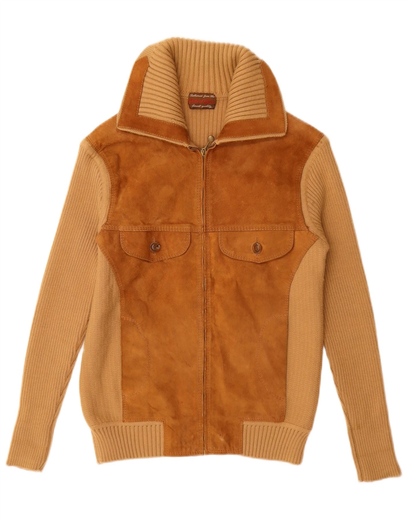 Suéter cardigã feminino de camurça VINTAGE Reino Unido 12 bloco colorido bege médio